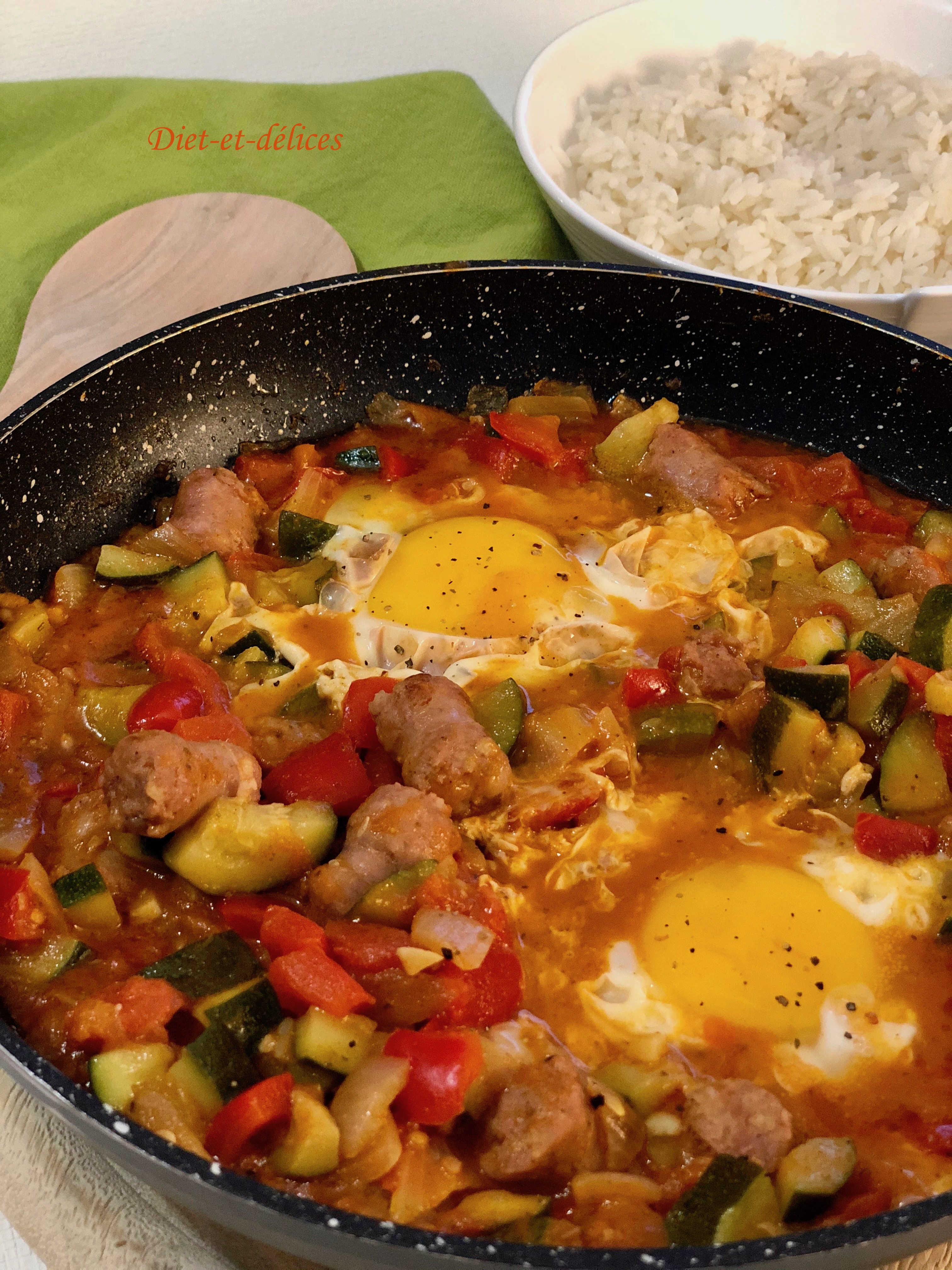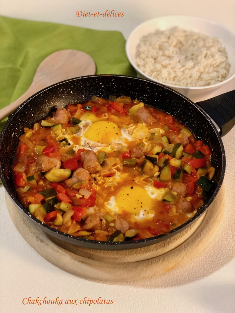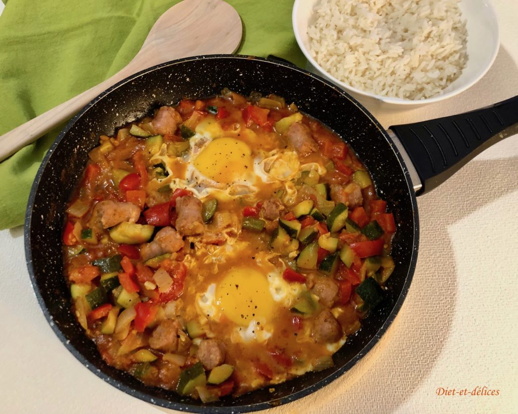 chakchouka, chipolatas, oeufs, plat complet, poivron, paprika fumé, courgette