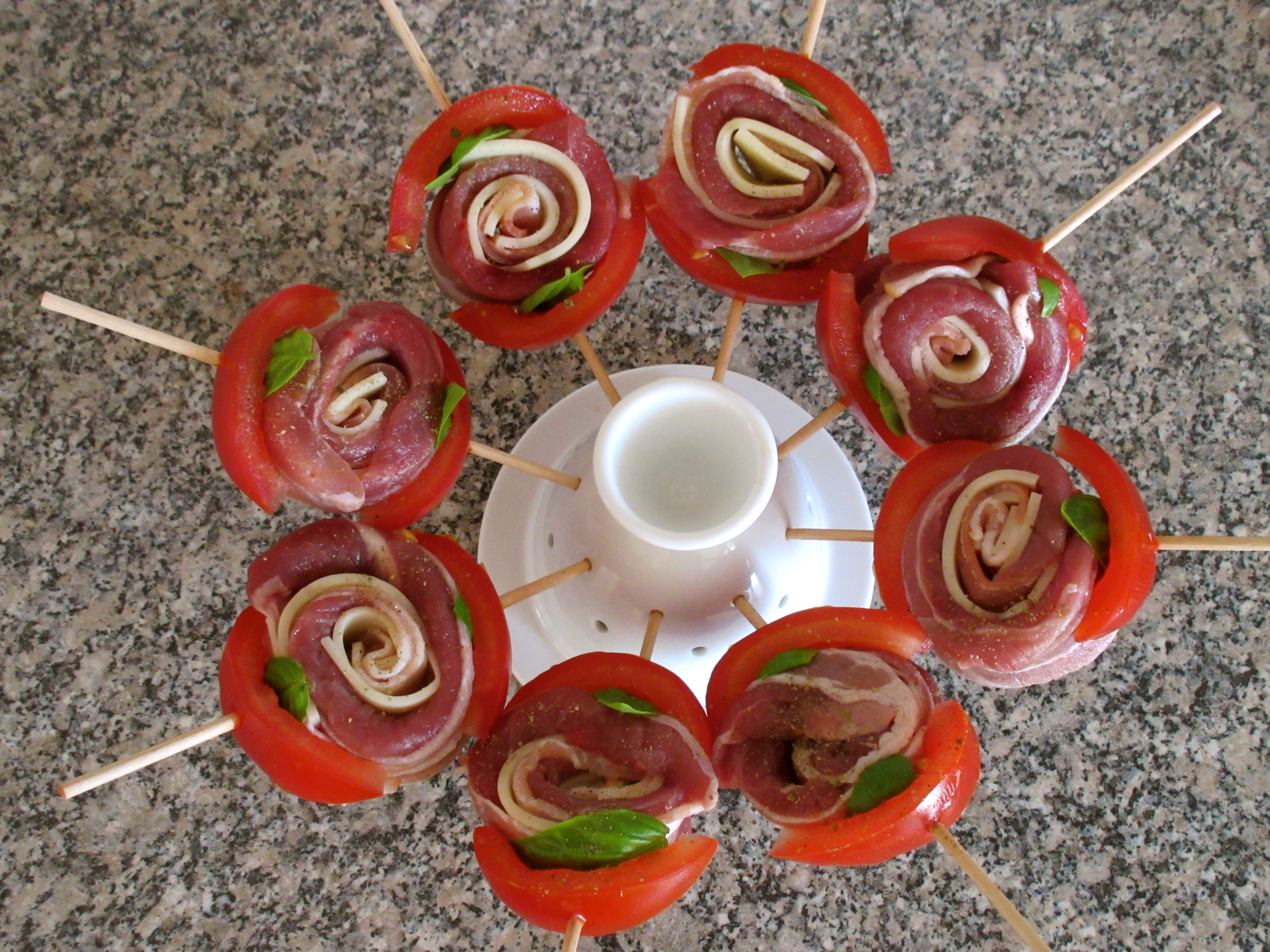 aiguillettes, canard, roulés, aiguillettes de canard,canard au four, roulés de canard, brochettes, brochettes de canard, lard, emmental, tomate,brochettes au four