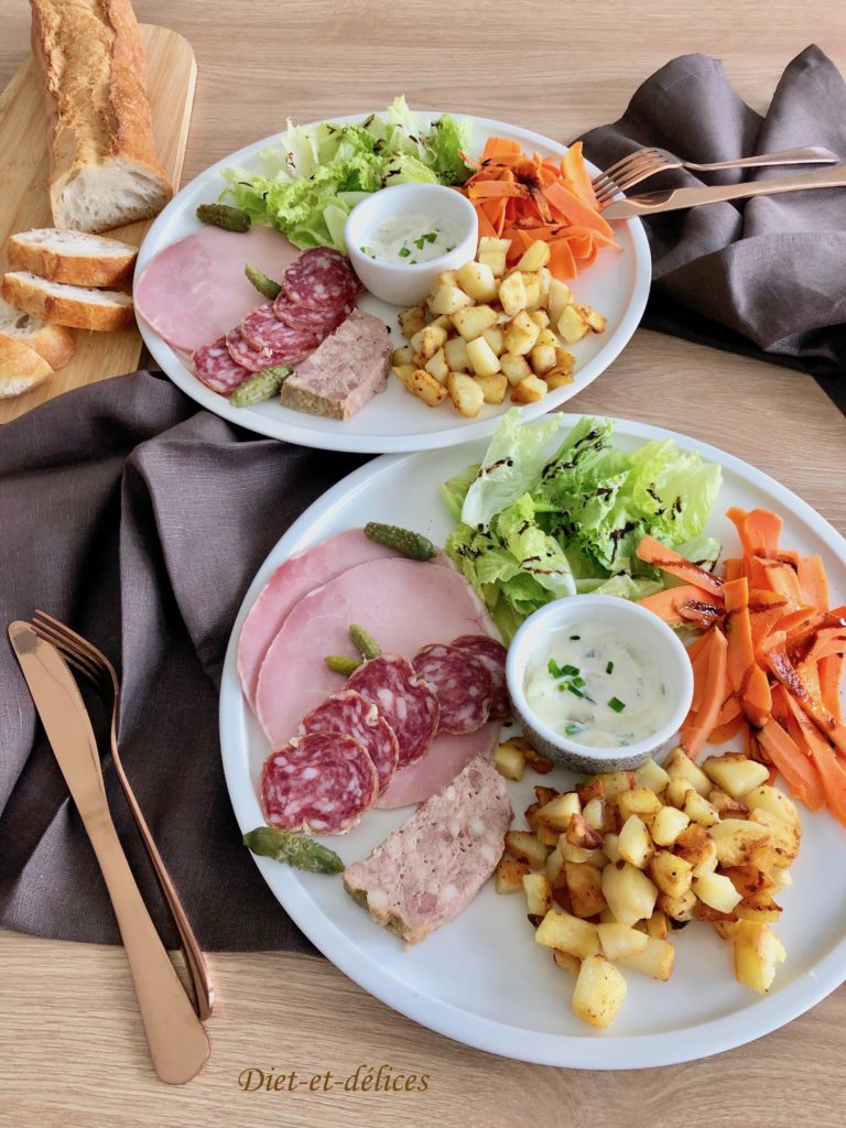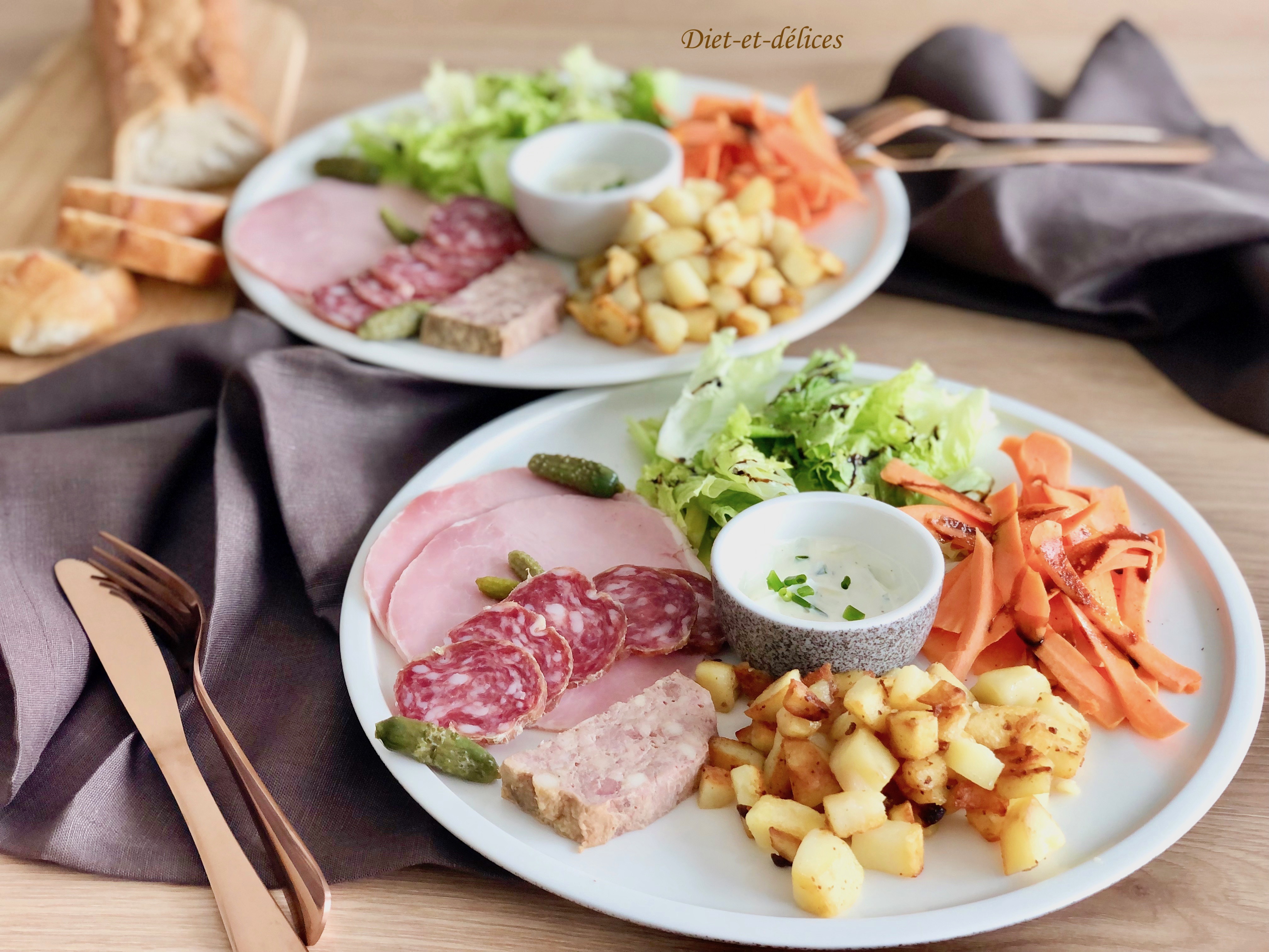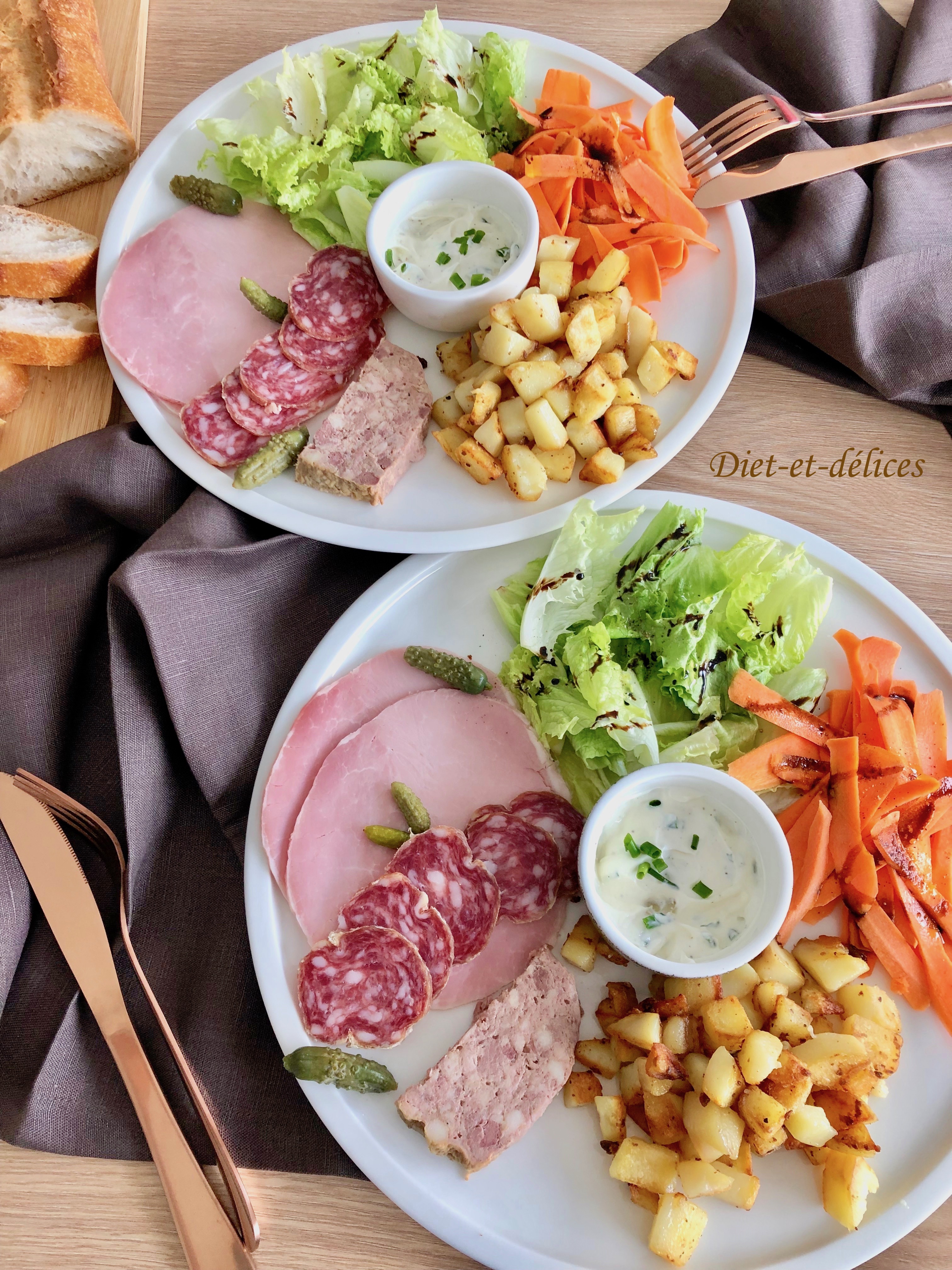 assiette campagnarde, pommes de terre rôties, charcuterie, rôti de porc, saucisson, pâté de campagne