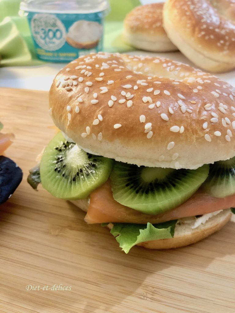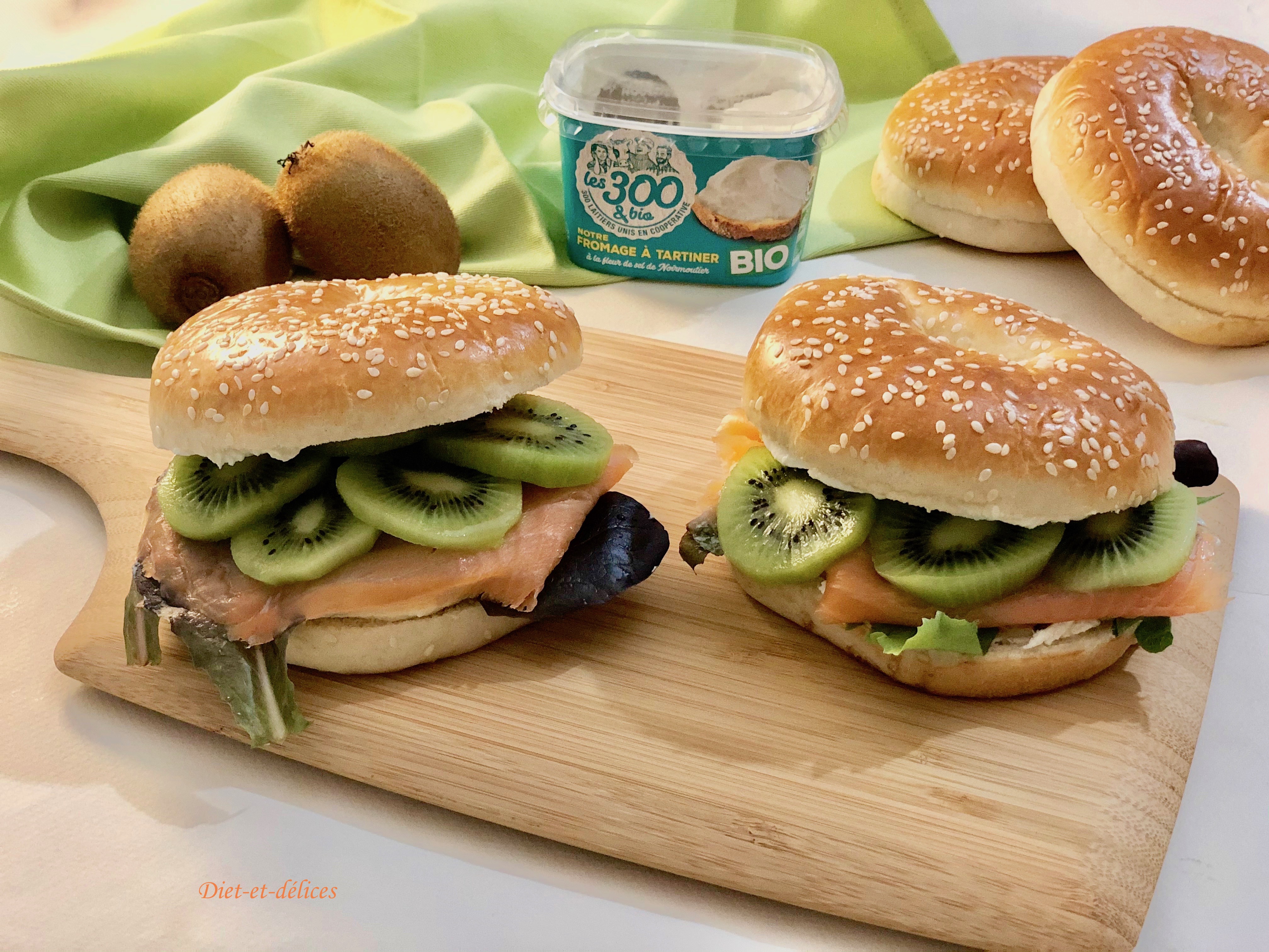 bagel, saumon, saumon fumé , bagel au saumon, kiwi, fromage à tartiner, mesclun, plat complet