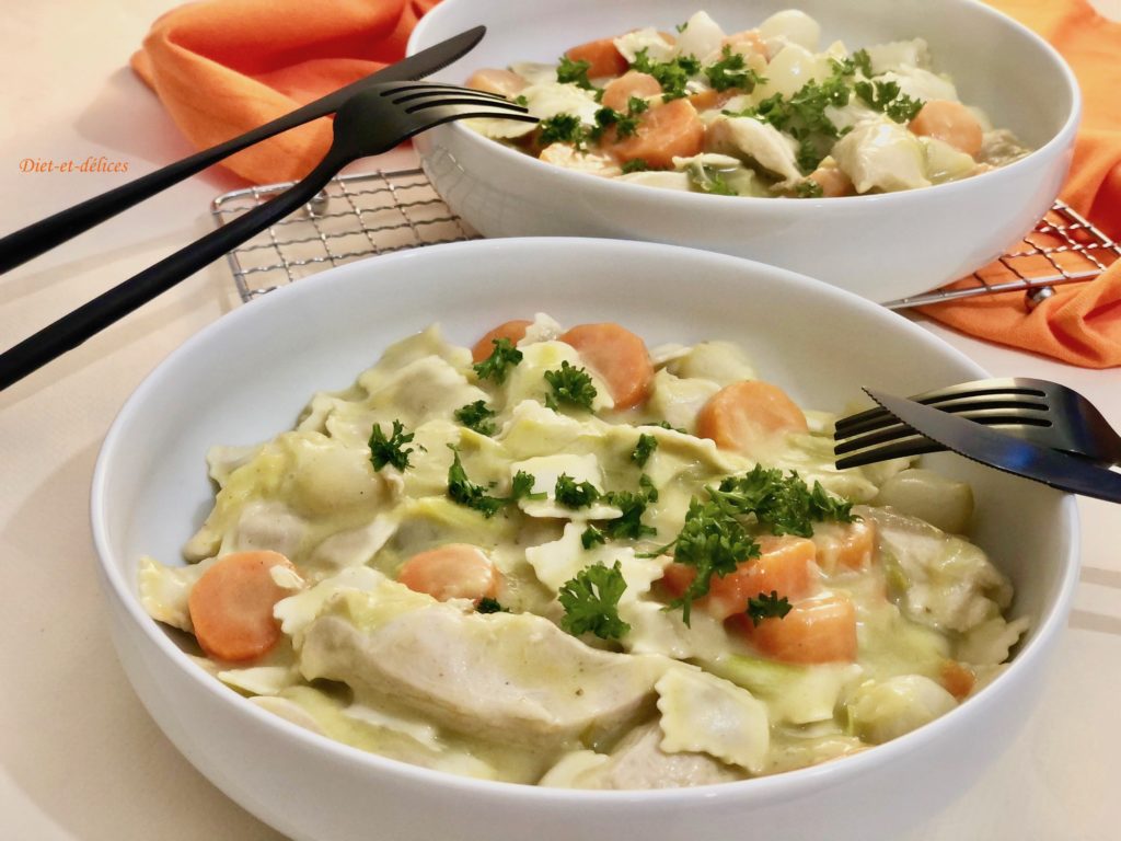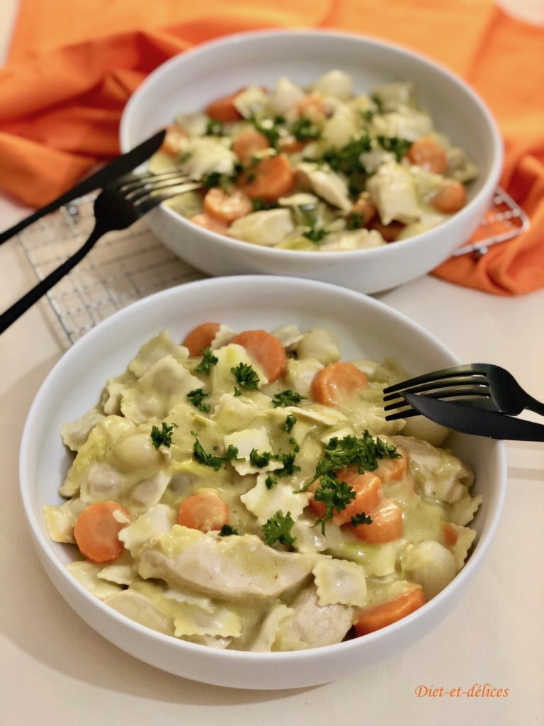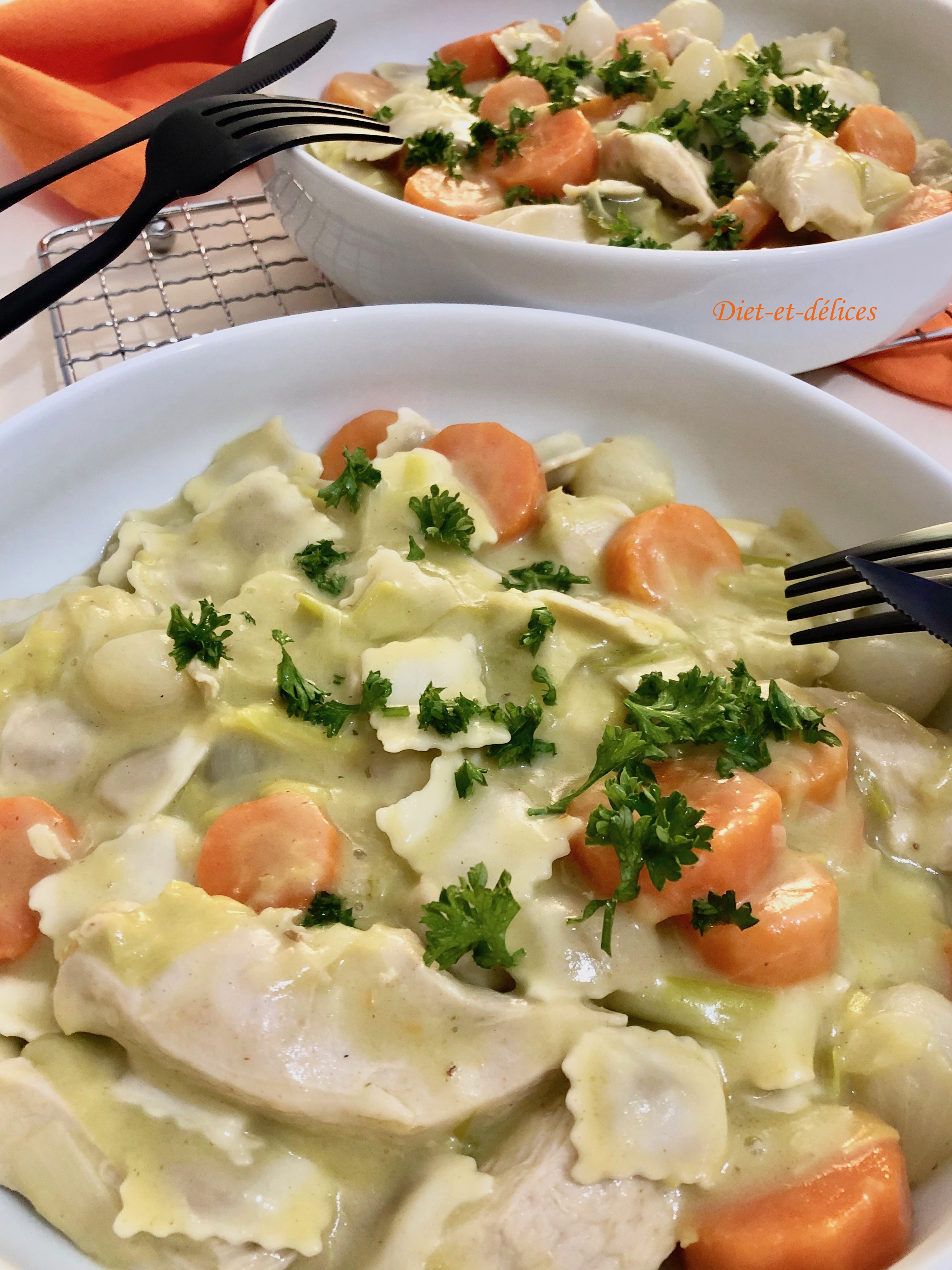 blanquette, poulet, filet de poulet, blanquette de poulet, ravioles, ravioles aux cèpes, carottes, poireaux, oignons grelots