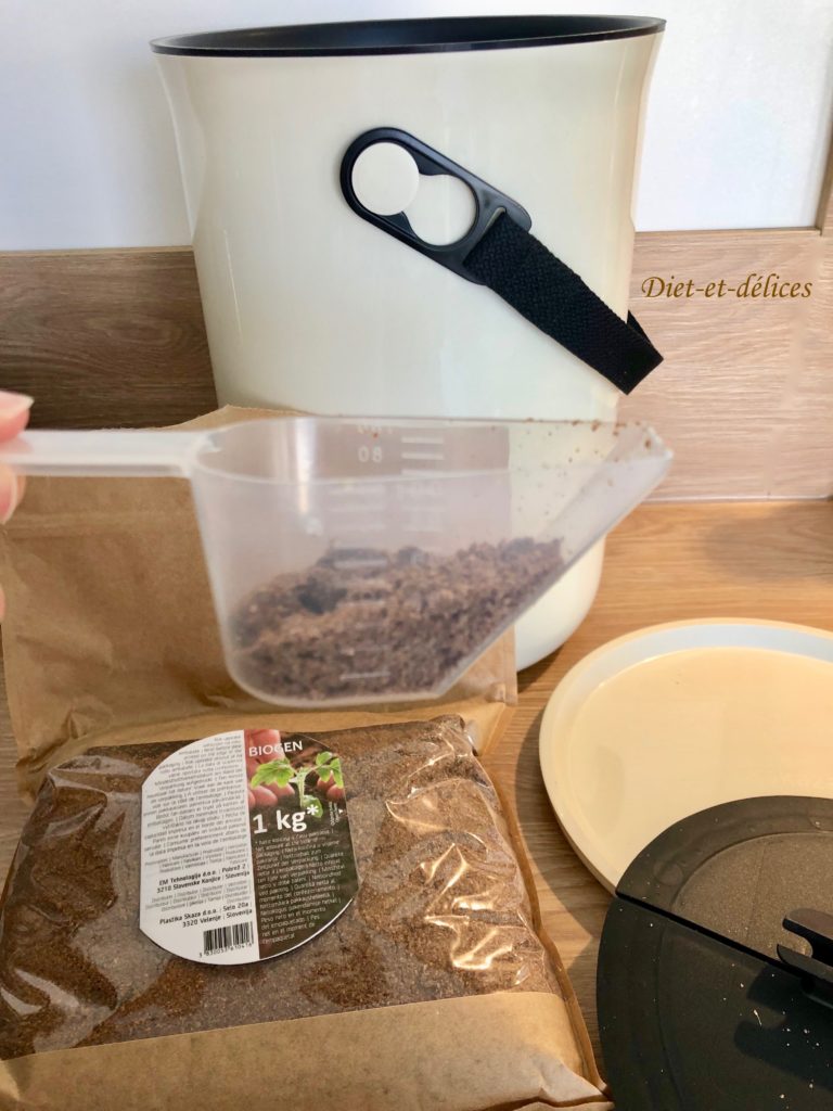 L’avantage avec ce composteur, c’est que les déchets ne moisissent pas grâce à la poudre naturelle contenue avec le composteur. Cette poudre, le Bokashi, est un mélange de sons et de mélasse (sucre et eau) enrichi en micro-organismes utiles (bactéries lactiques, levures, organismes photosynthétiques, actinomycètes et champignons enzymatiquement actifs). En effet, les déchets biologiques fermentent sans odeur, sans moisissure et donc sans insectes !