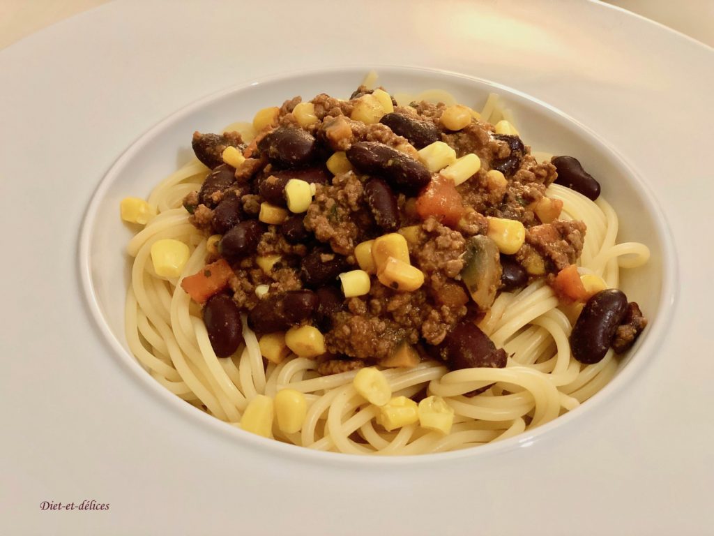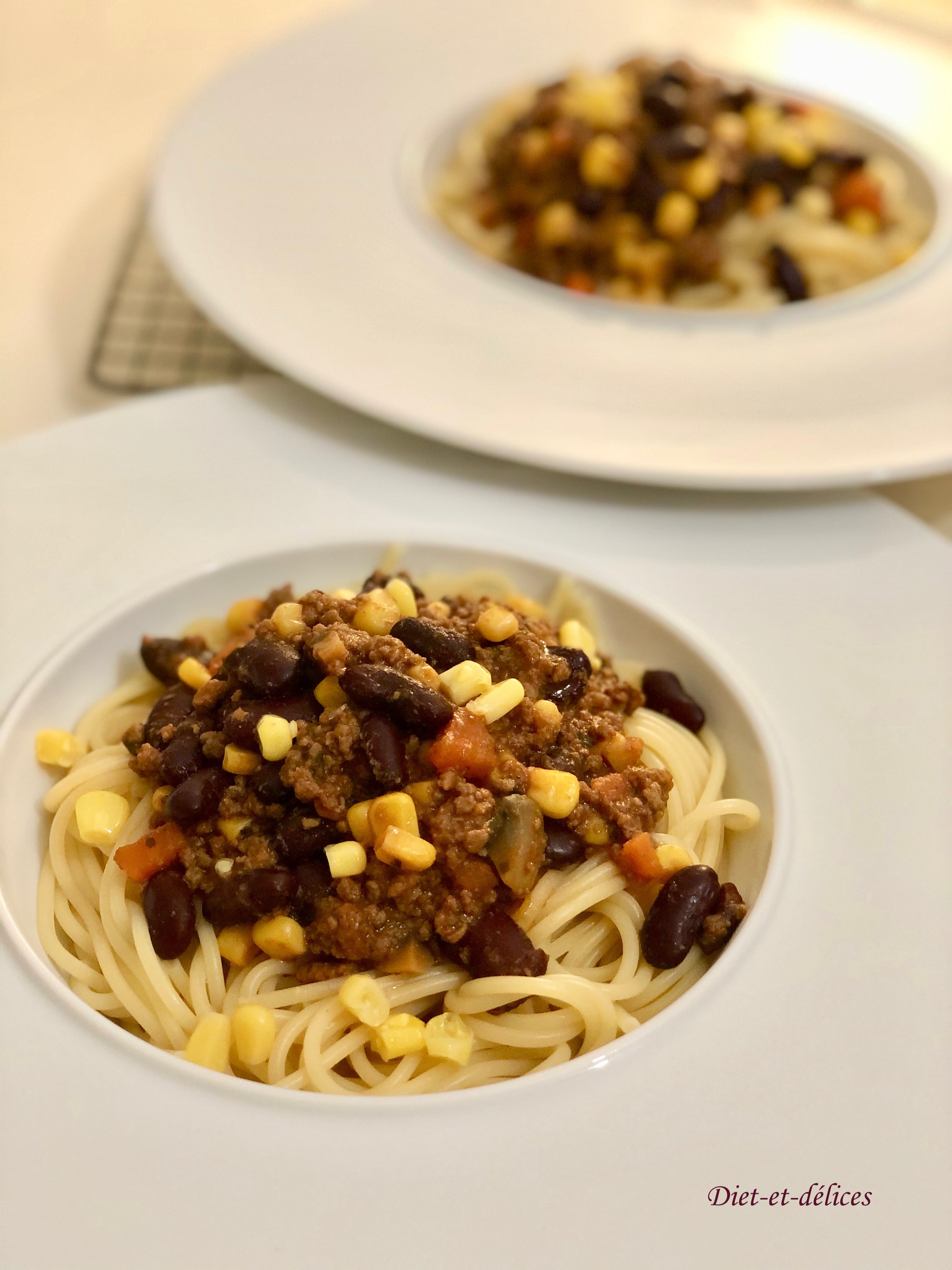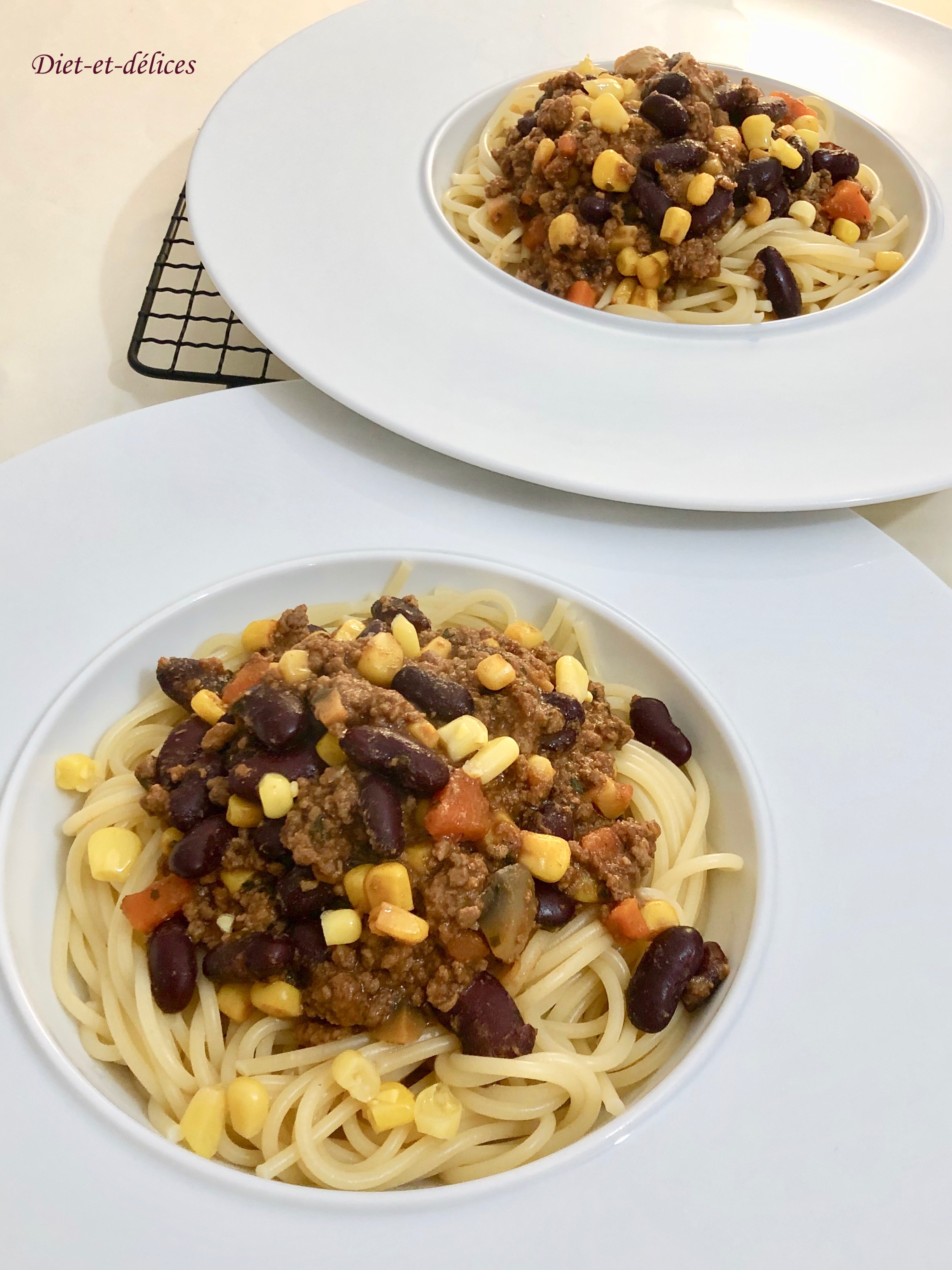 bolognaise, sauce bolognaise, viande hachée, bolognaise mexicaine, haricots rouges, maïs