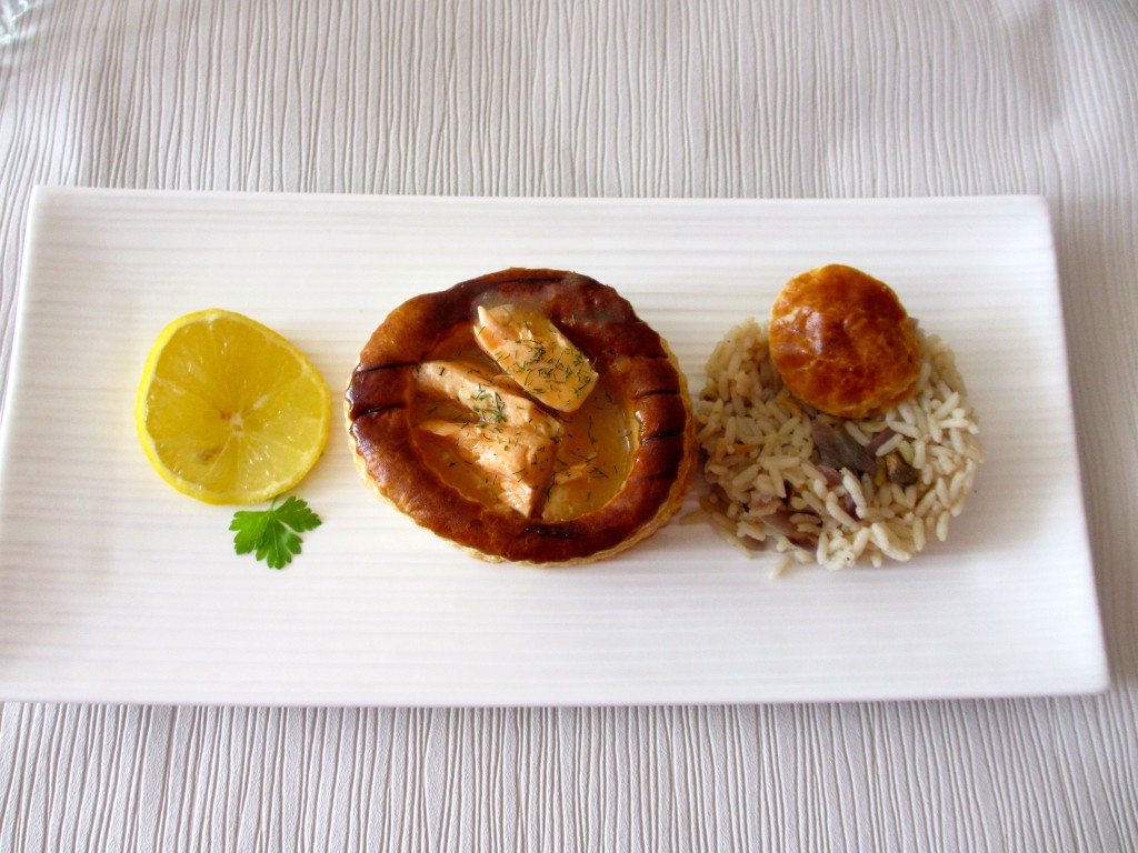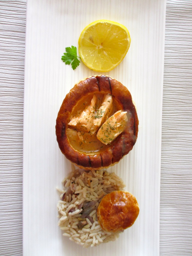 bouchée à la reine, vol au vent, bouchée à la reine au saumon, vol au vent au saumon,saumon, bisque de homards , bisque, feuilleté, sauce, poisson, aneth, plat complet