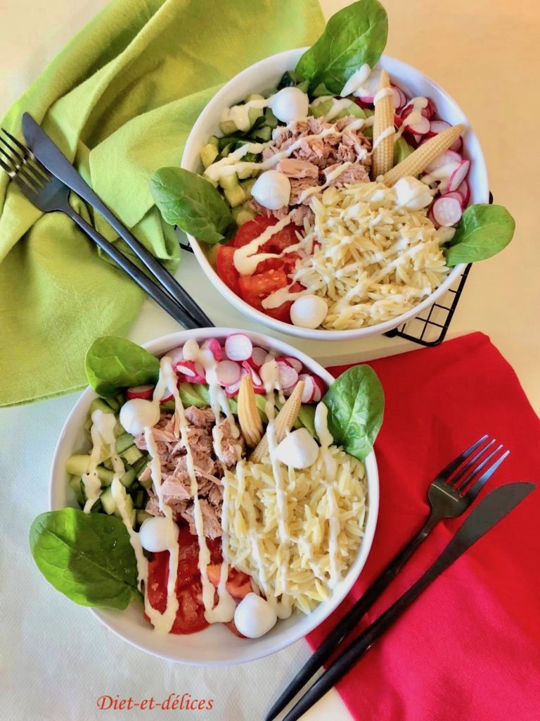 thon, bowl, pâtes, radis, tomate, crudités, maïs , moutarde, concombre