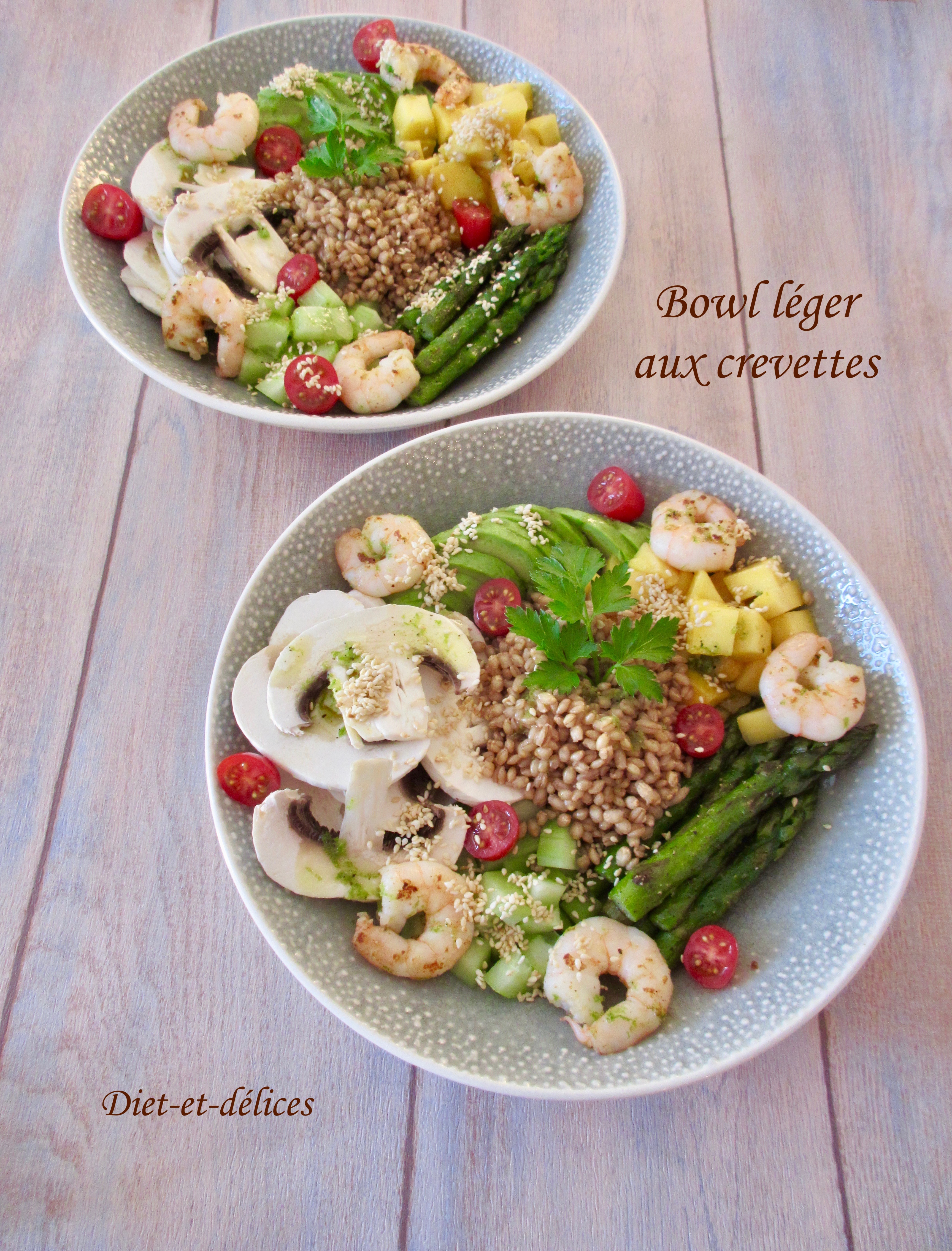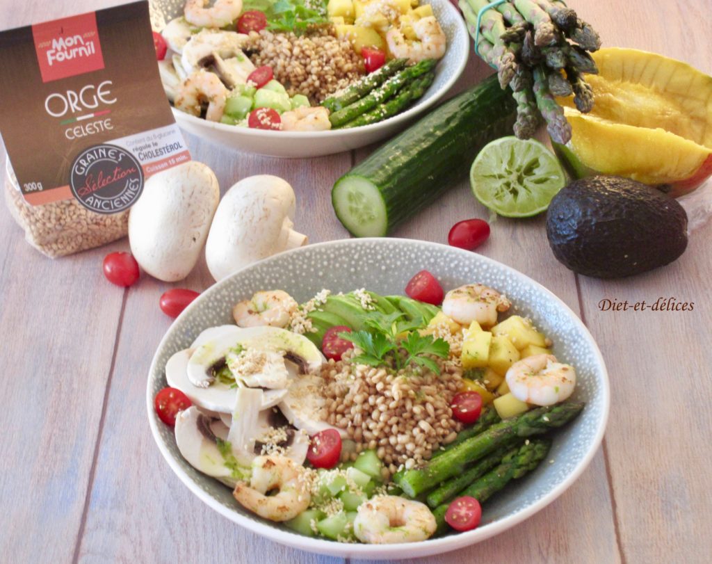 bowl, crevettes, orge, champignons, asperges, mangue, concombre, avocat, plat complet