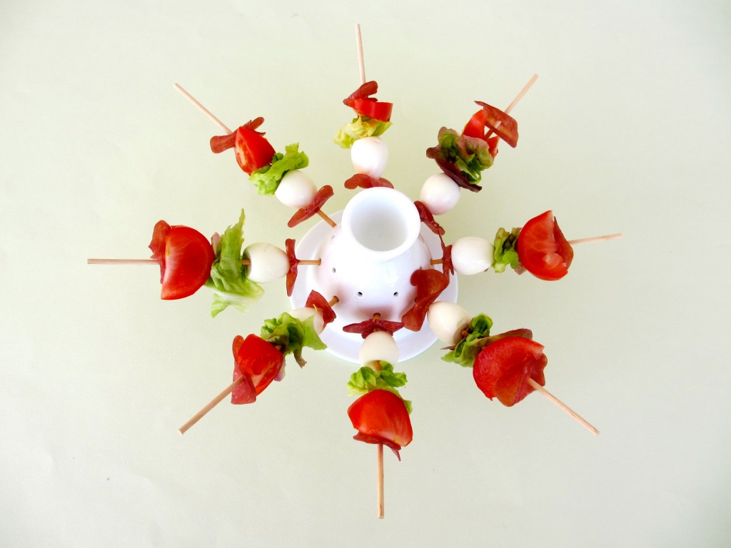 Accueil » Recettes » Amuses bouches » Brochettes apéritives fines tranches de saucisson – tomate – oeuf de caille