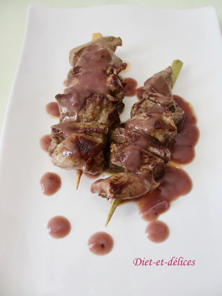 - Déposer les brochettes sur les assiettes, ajouter quelques pincées de fleur de sel puis napper de la sauce échalote et vin rouge.