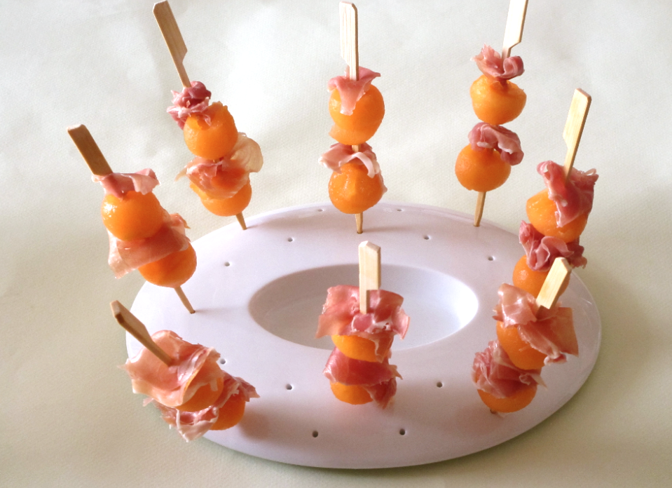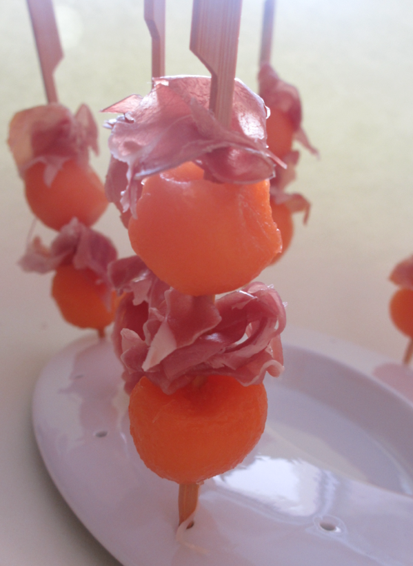 - Alterner sur des piques en bois une bille de melon, un peu de jambon, une seconde bille et enfin du jambon.