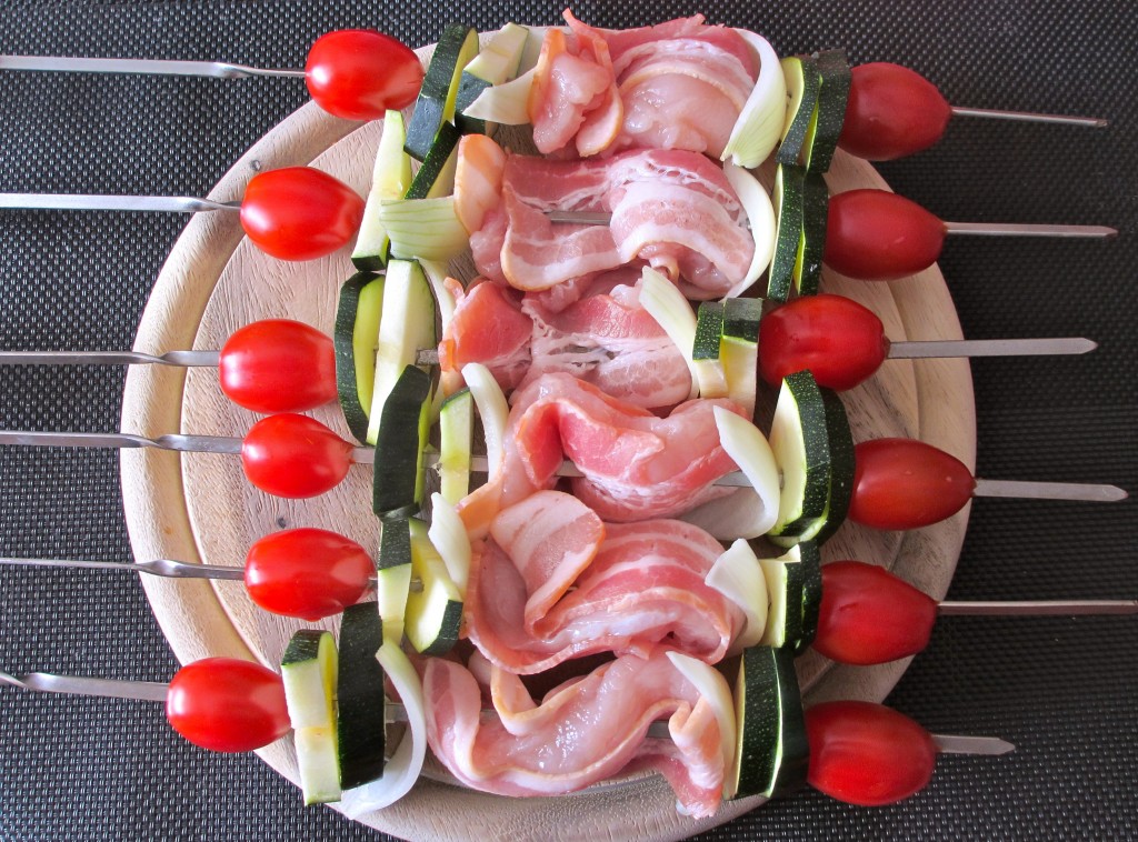 brochettes, poulet, volaille, brochettes de poulet, aiguillettes,tomates cerises, brochettes de volaille,aiguillettes de poulet, lard, courgette, barbecue, oignon, marinade, diététique, cuisine d’été