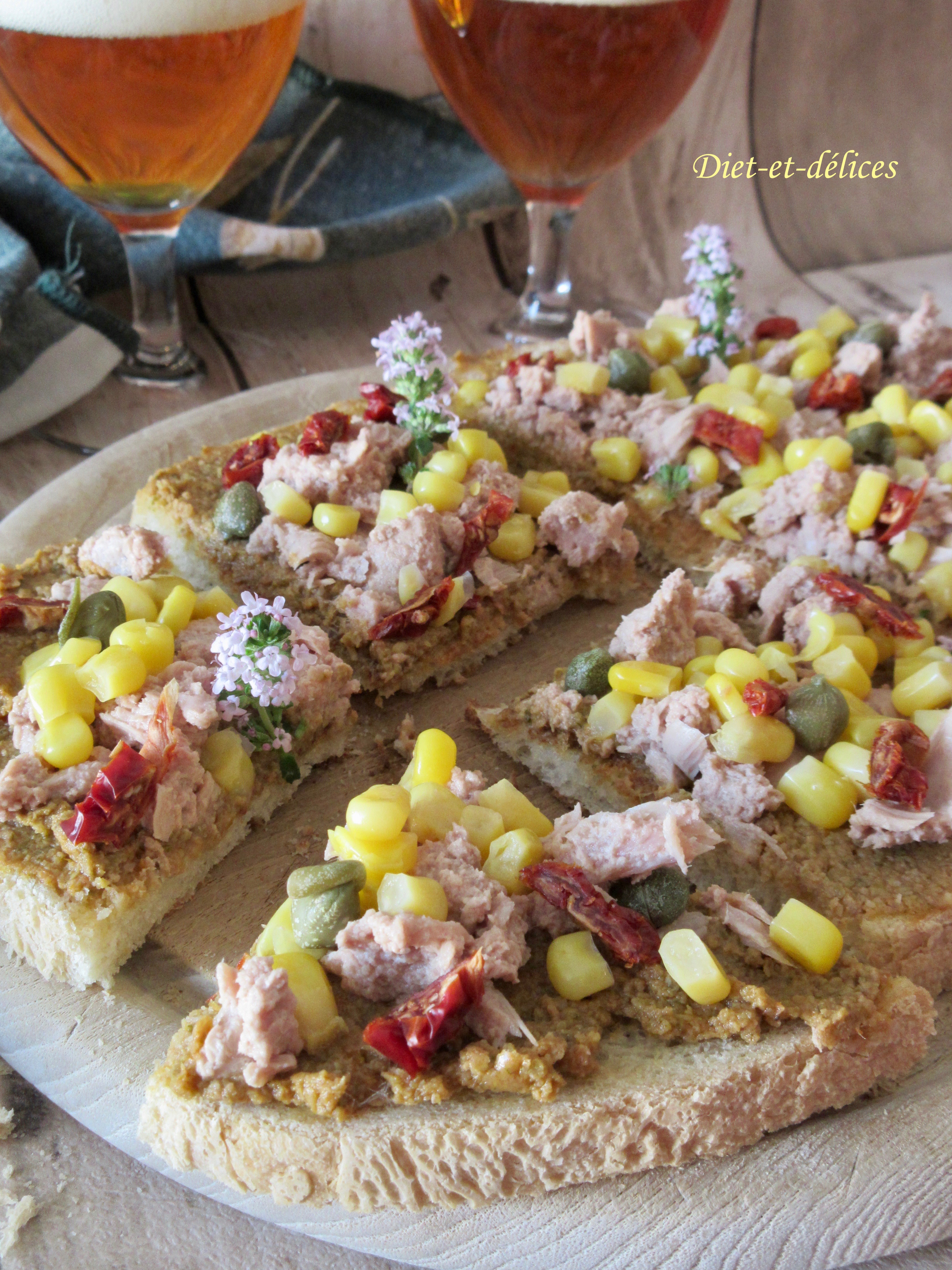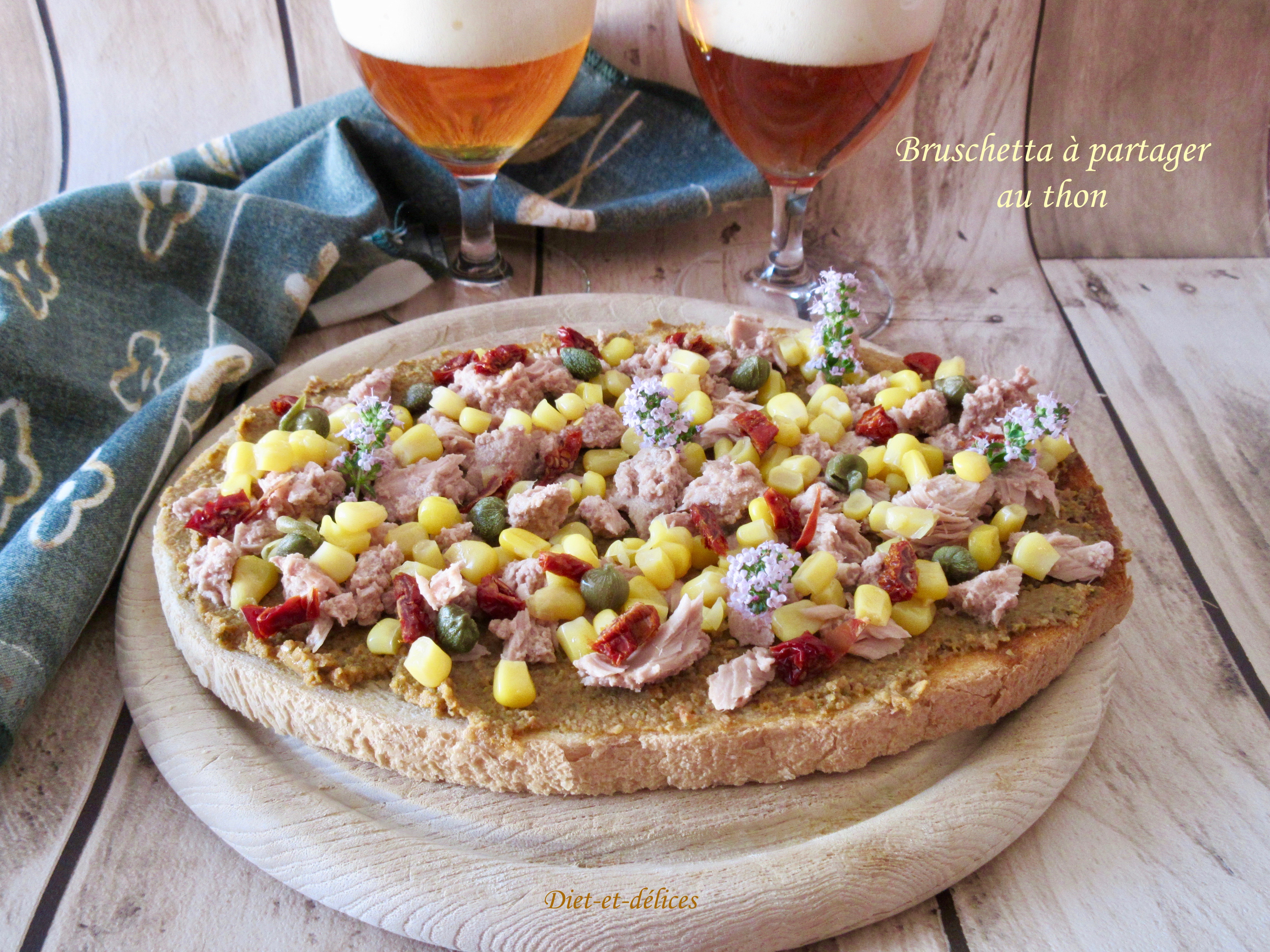 bruschetta, apéritif, thoïonade, thon, maïs, câpres, tomates séchées, fleurs de thym