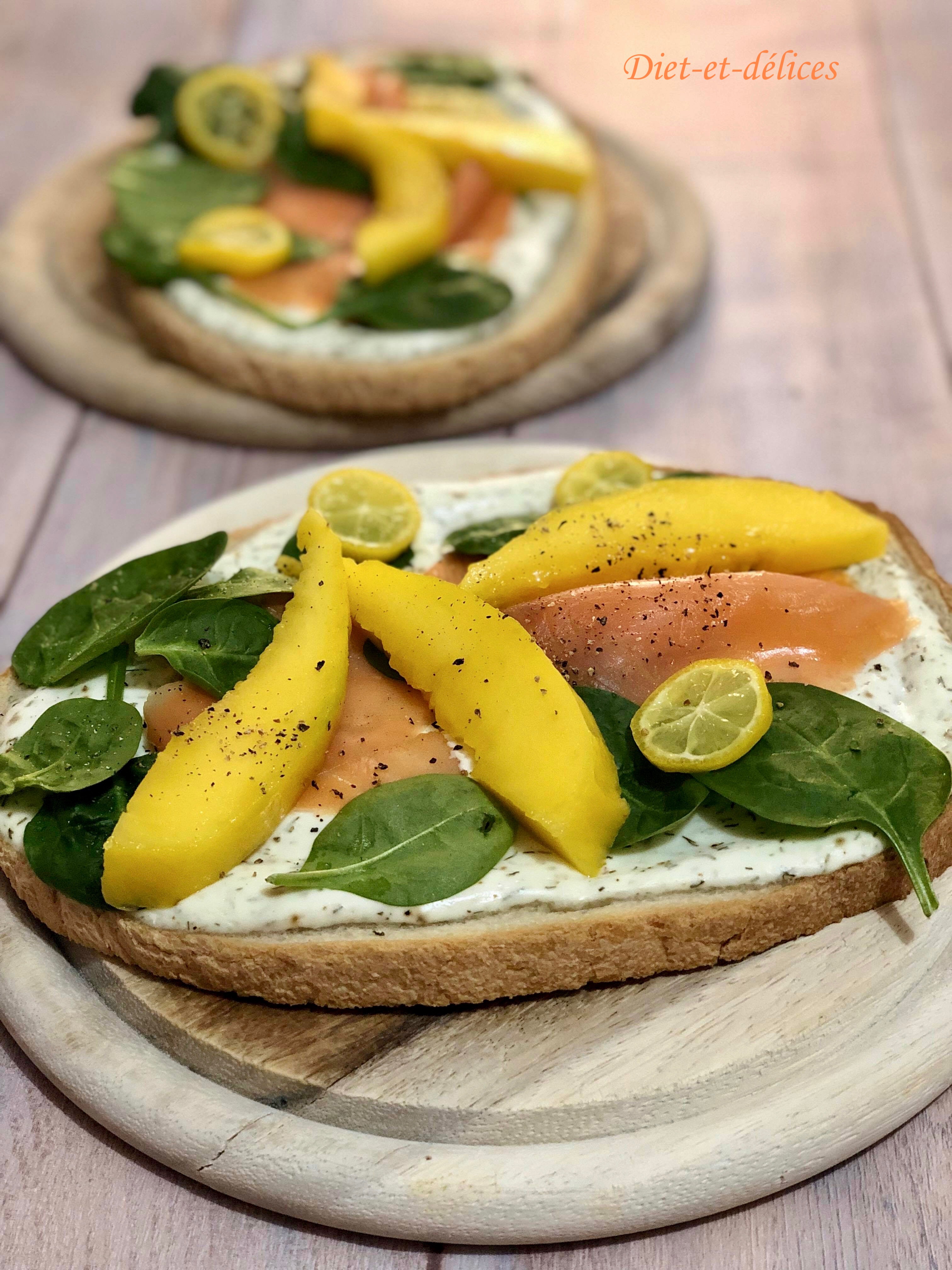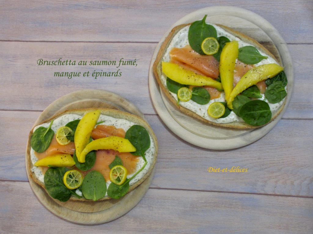 bruschetta, saumon fumé, épinard, bruschetta au saumon, fromage blanc, aneth, lemonquat, mangue, sucré salé