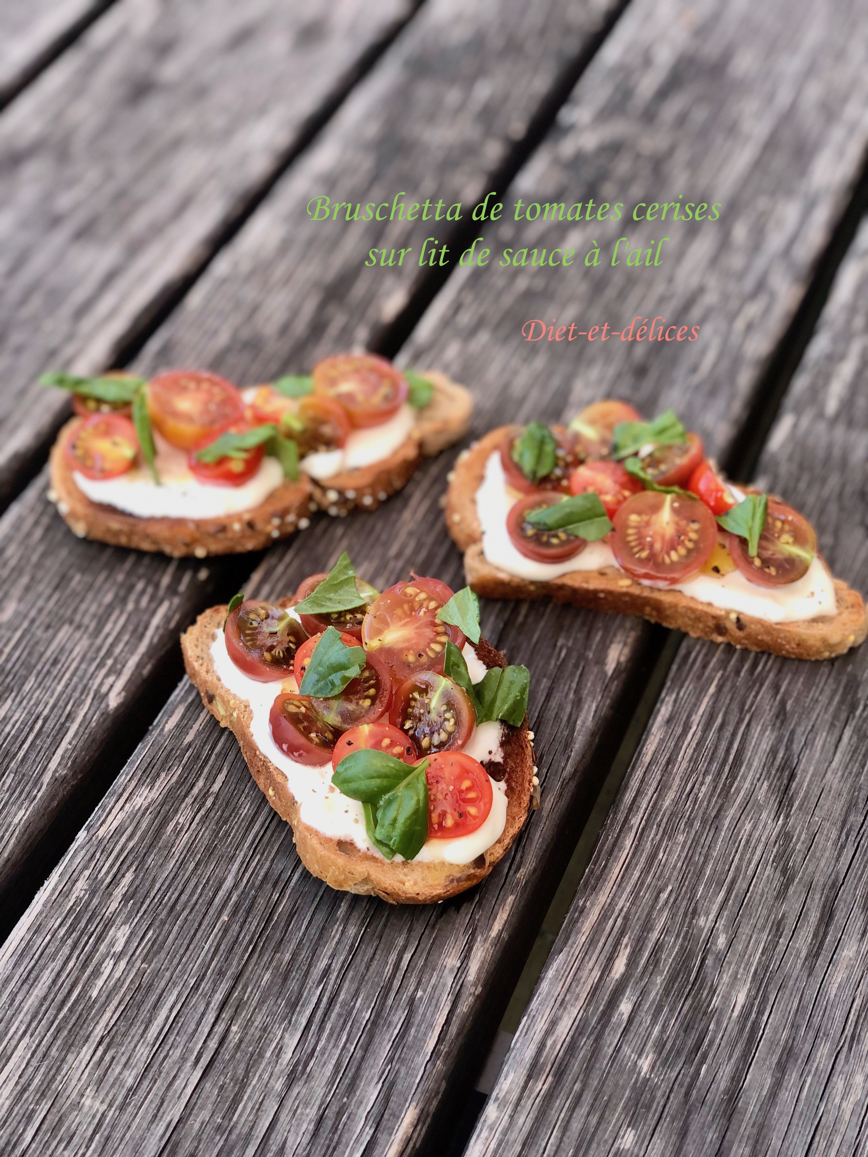 bruschetta, tomates cerises, sauce à l’ail, basilic, apéritif, toast
