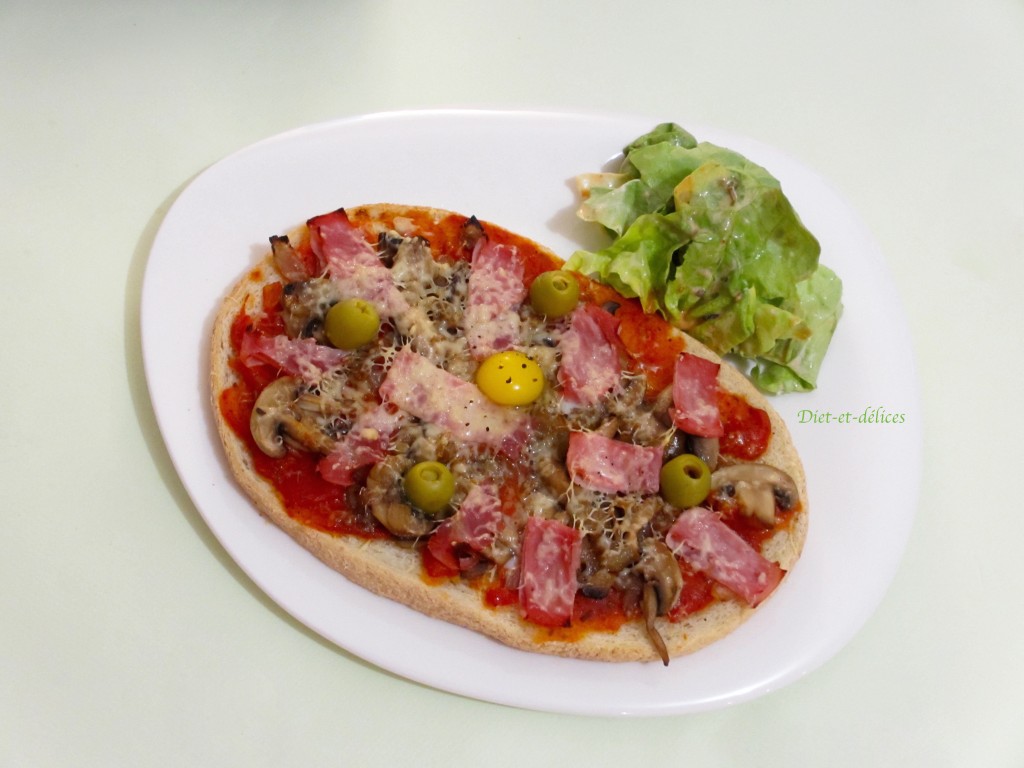 bruschetta, pizza, jambon, jambon blanc, coulis de tomates, champignons, olives, emmental, oeuf de caille, sauce tomate, oignon