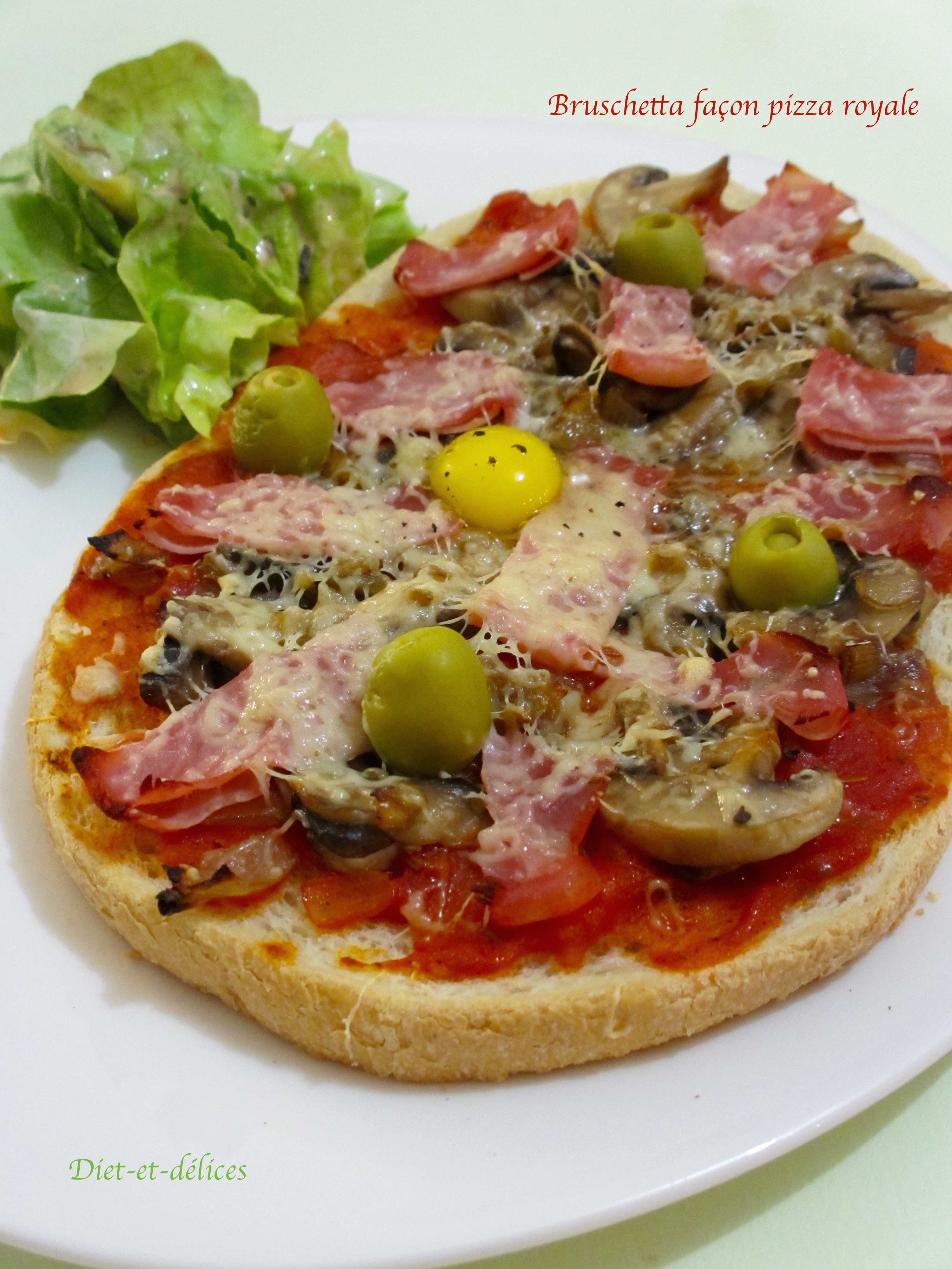 cuisine du monde, cuisine italienne, bruschetta, jambon, sauce tomate, bruschetta façon pizza, jambon blanc, olives, bruschetta façon pizza royale, tartine chaude, oeuf de caille, champignons, plat complet, tartine, cuisine facile