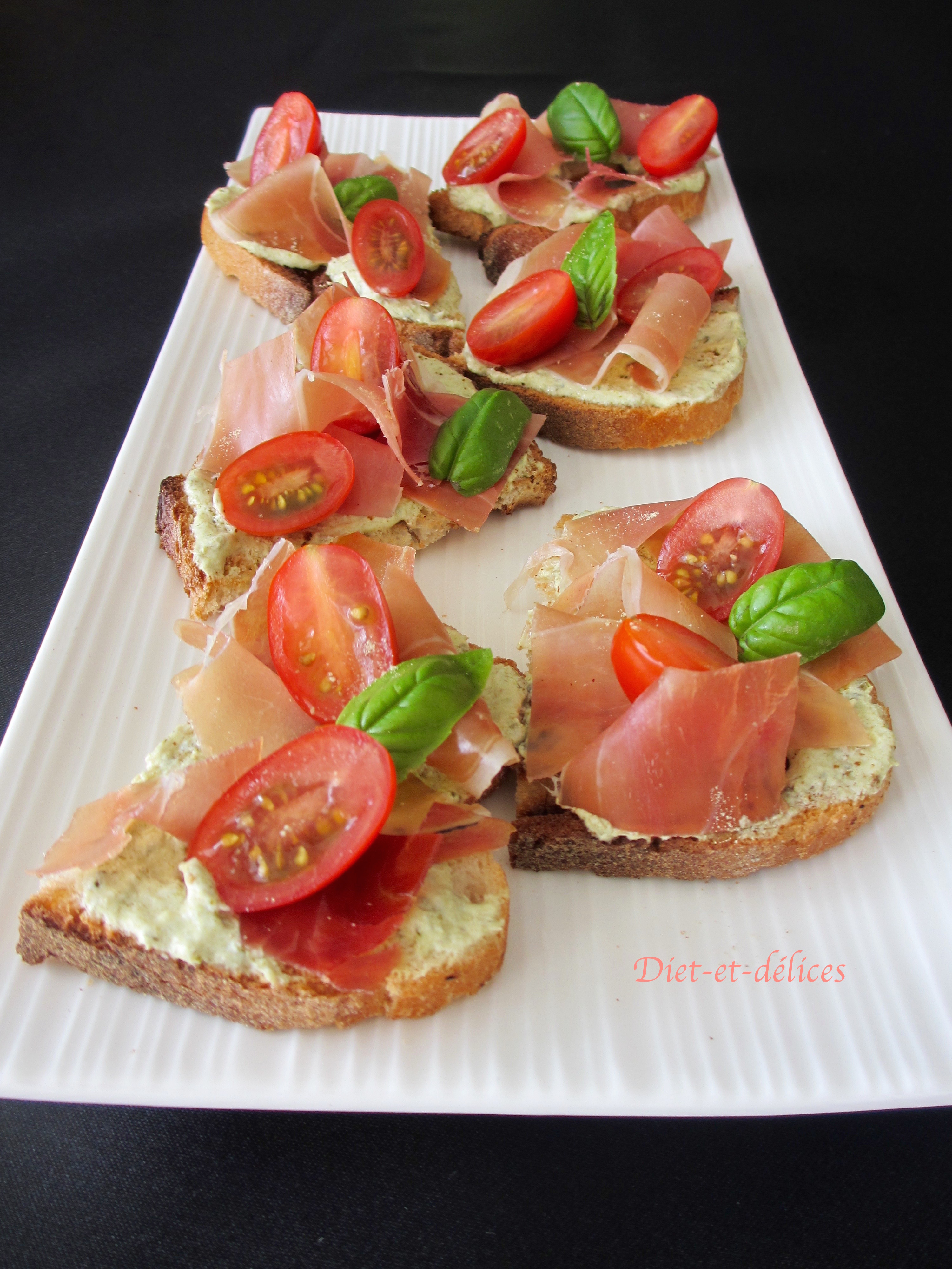 bruschettini, bruschetta, pesto, fromage blanc, italien, tomates, tomates cerises, basilic, jambon, jambon cru , tartines, apéro