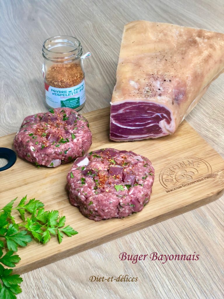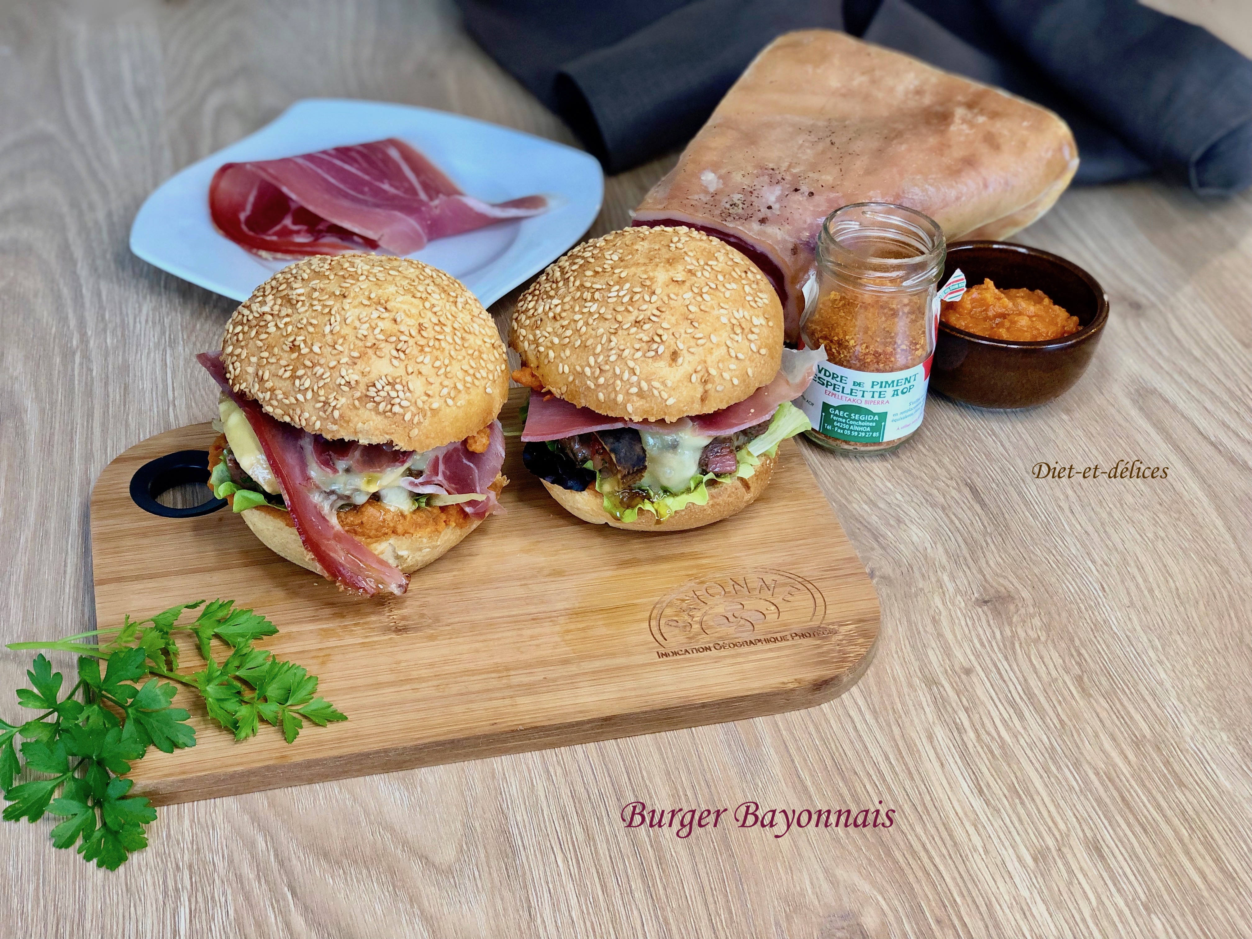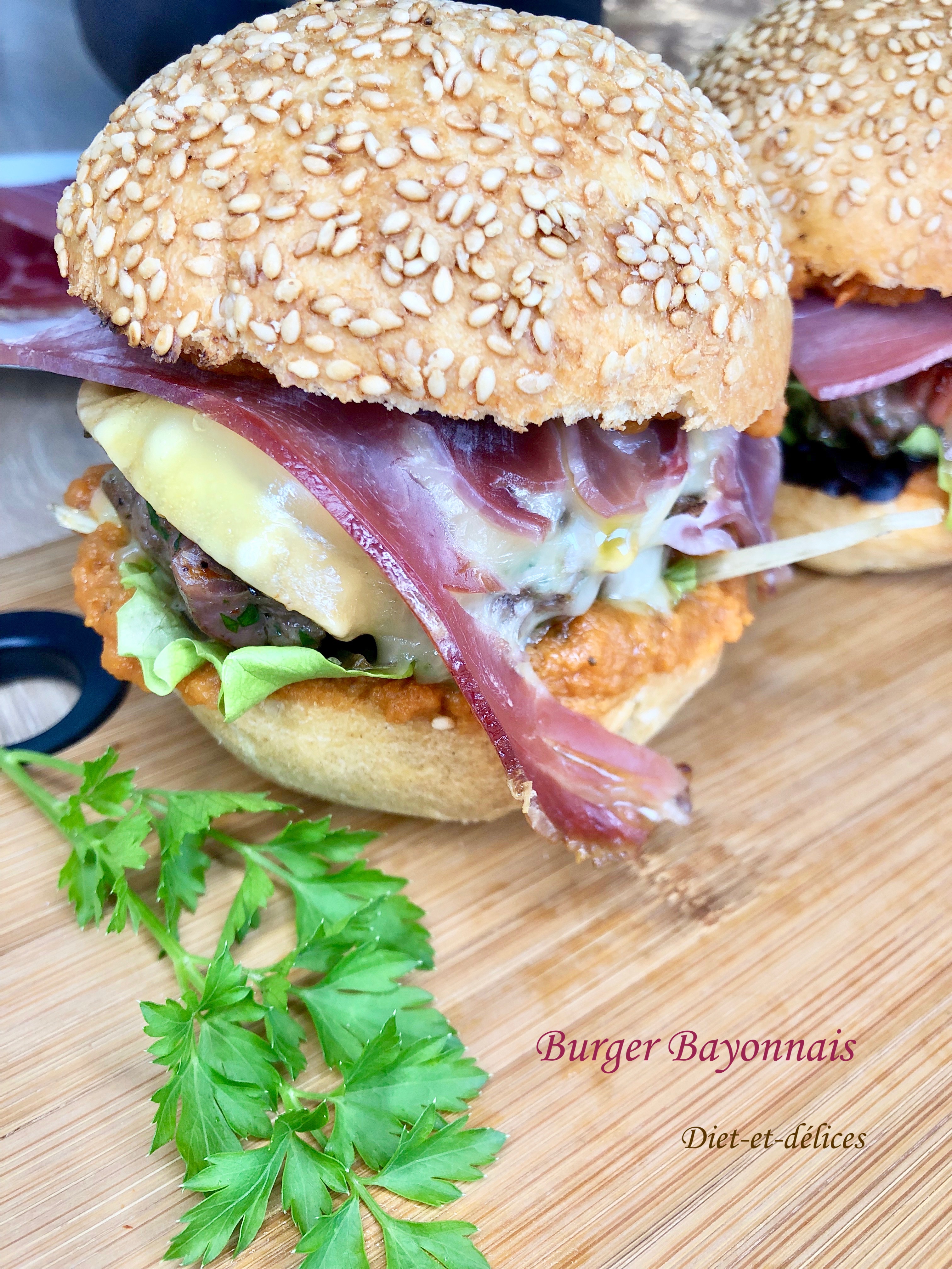 burger, jambon de Bayonne, tomme des Pyrénées , burger au jambon, jambon, piment d’espelette , poivron