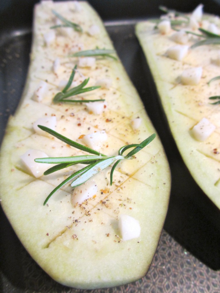 - Couper l’ail confit en petits dés et les parsemer sur l’aubergine.