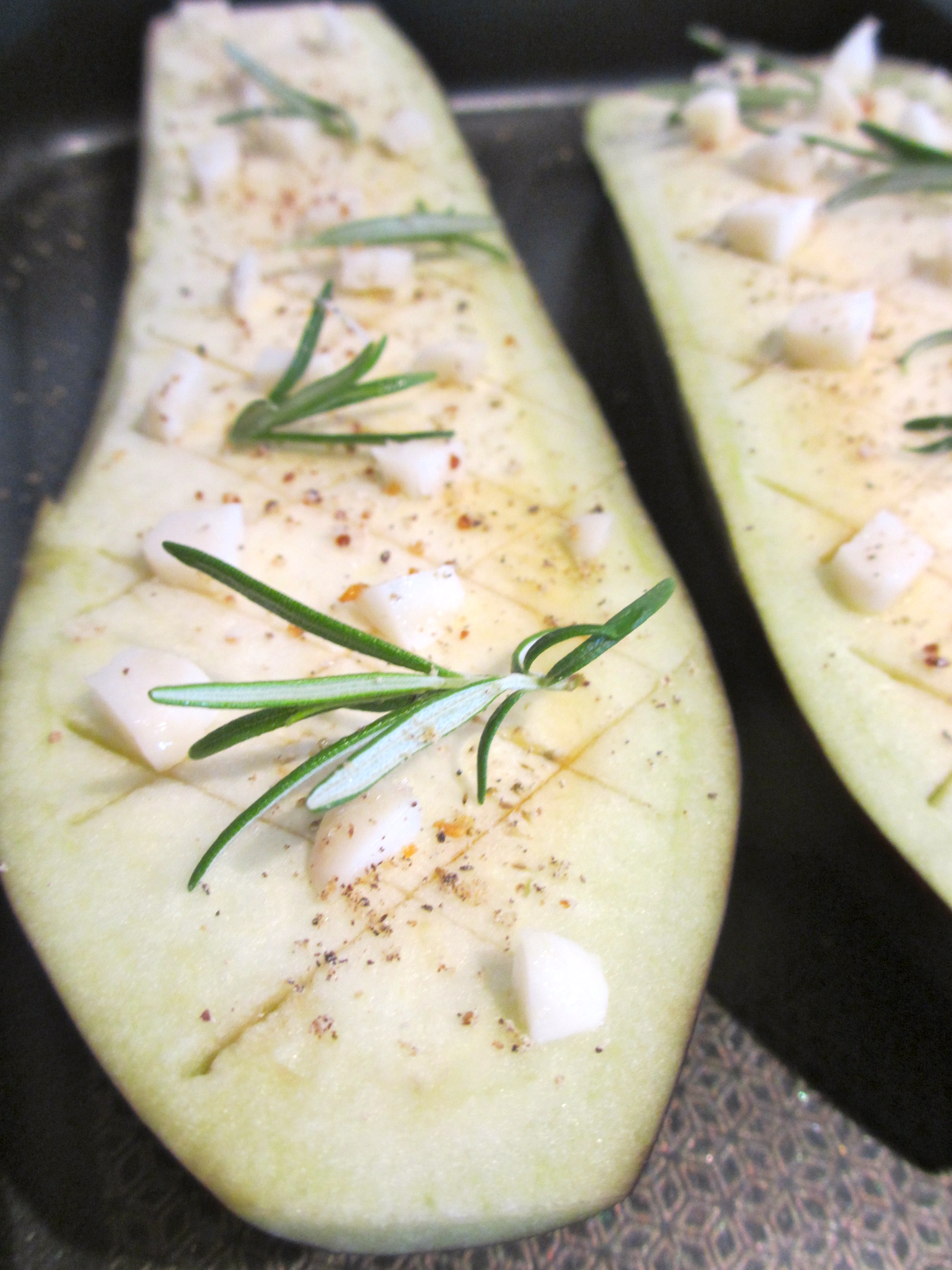 - Quadriller la chaire de l’aubergine et disposer les demies aubergines dans un plat à gratin.