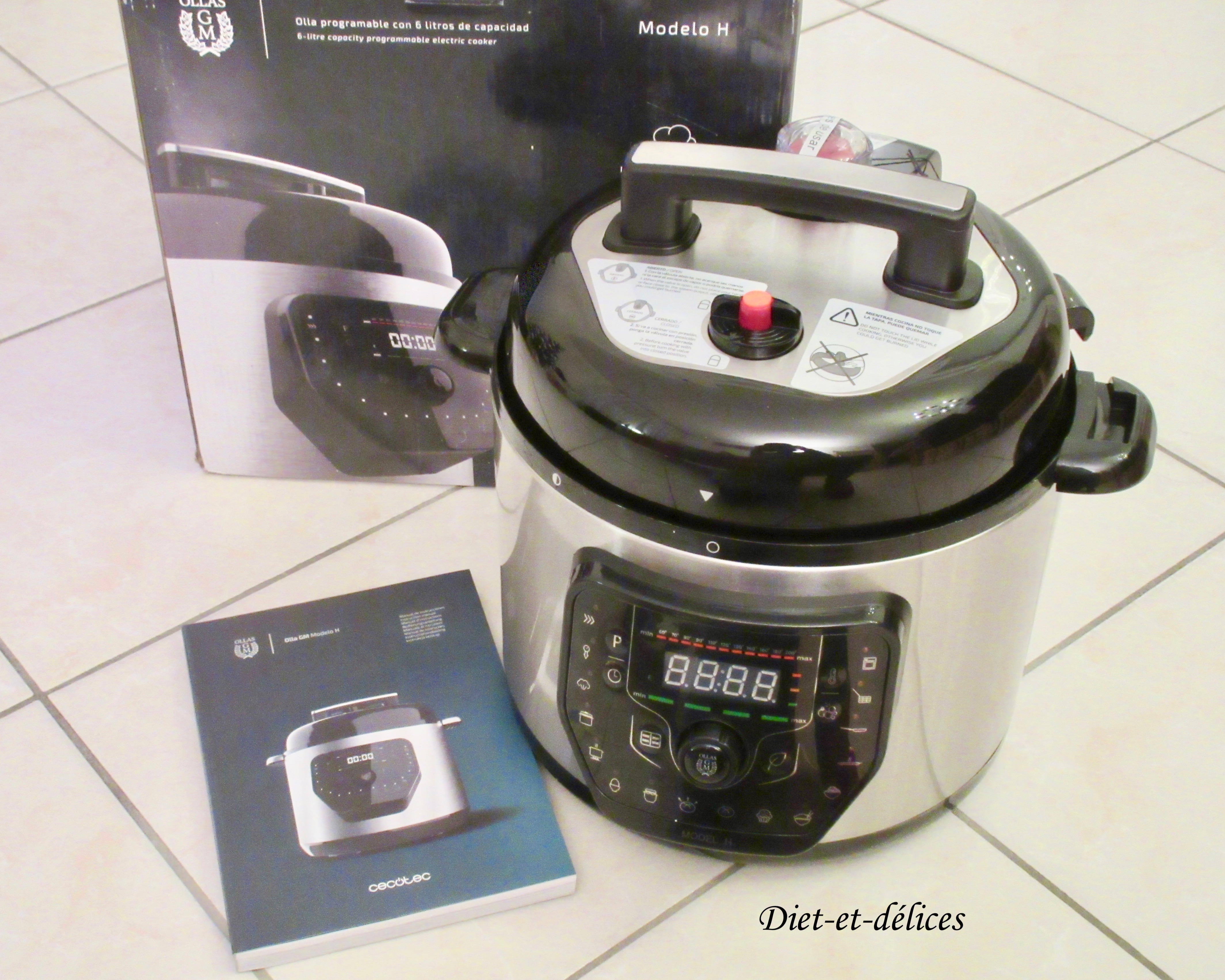 Cecotec propose notamment des autocuiseurs. Voici la présentation de l’autocuiseur GM H. Programmable jusqu’à 24h, il a une capacité de 6 litres et est garanti 2 ans. Son écran LED disposant d’un panneau de contrôle très ergonomique permet une visualisation complète du processus de cuisson.Ce robot multifonctions permet de préparer 19 manières différentes de plats dont entrées, riz, pâtes, ragoûts, estouffades, poissons, desserts, … En effet, l’autocuiseur dispose de 16 menus différents : turbo, pression (5 pression ajustables jusqu’à 90 kPa pour cuisiner plus rapidement), vapeur, mijoter, feu lent, pocher, confire, fermenter, pain, dessert, riz, pâtes, plancha, faire revenir, frire, four. Vous pourrez donc élaborer tout type de recettes grâce à ses 11 températures ajustables jusqu’à 200°C. Ses 15 systèmes de sécurité assurent le fonctionnement correct de l’autocuiseur avec des pressions élevées sans aucun danger.