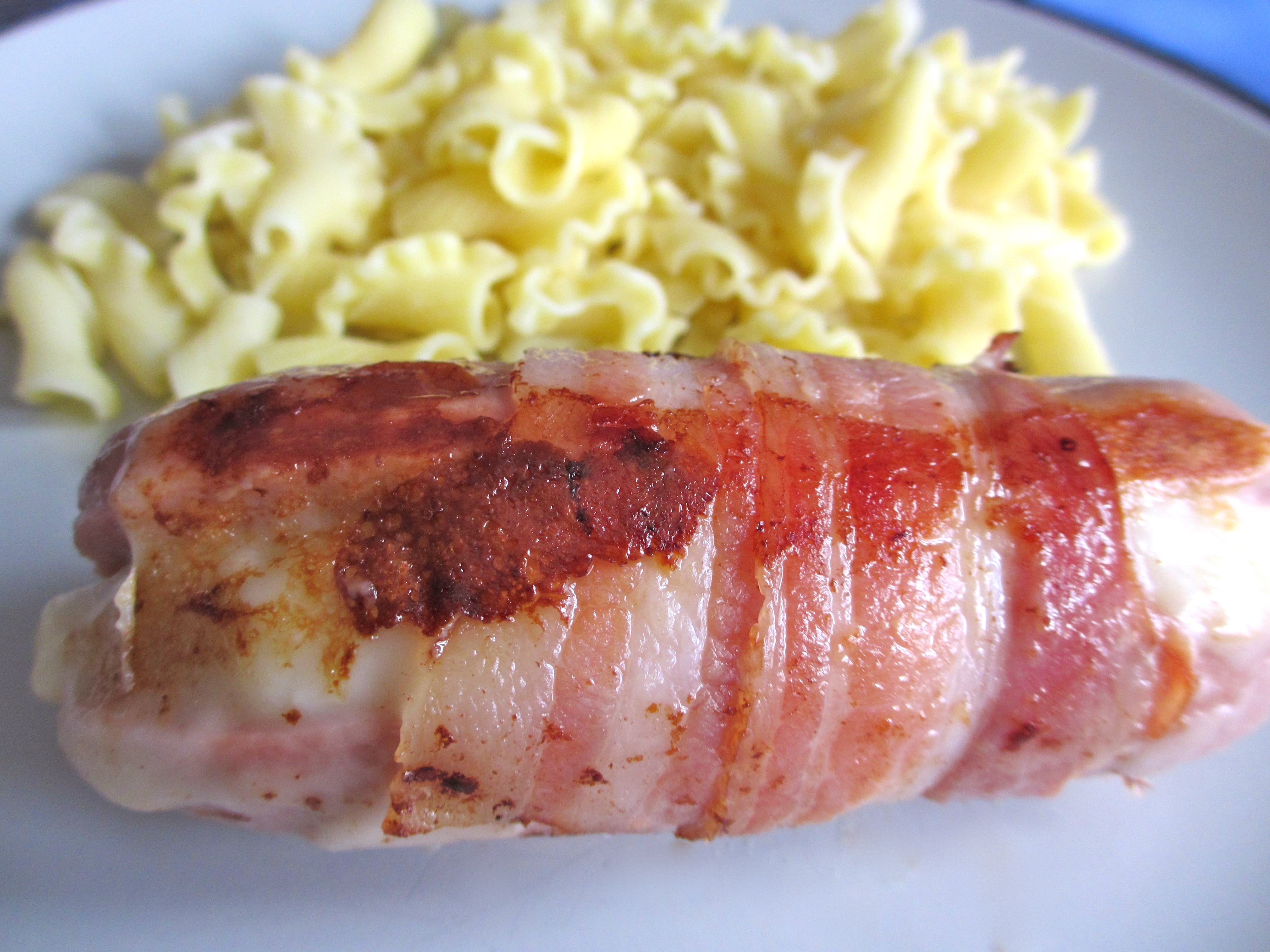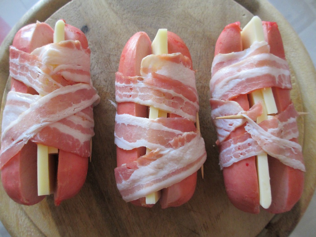- Enrouler chaque cervelas de deux bandes de lard en les serrant bien.