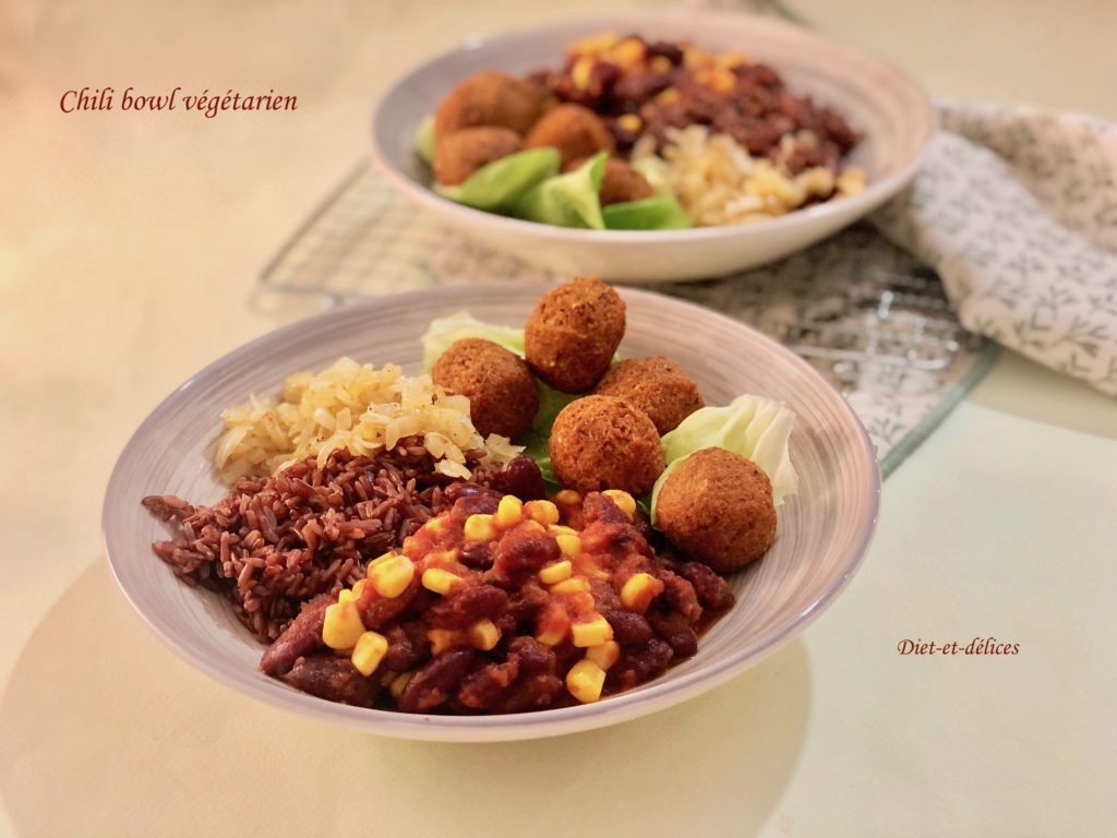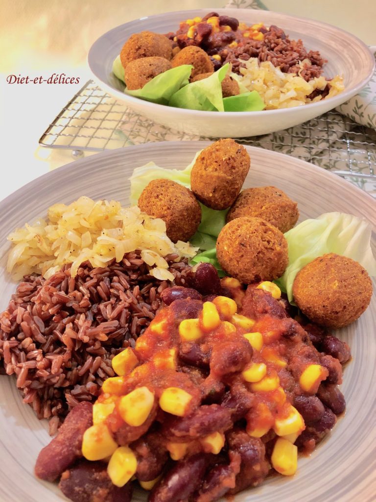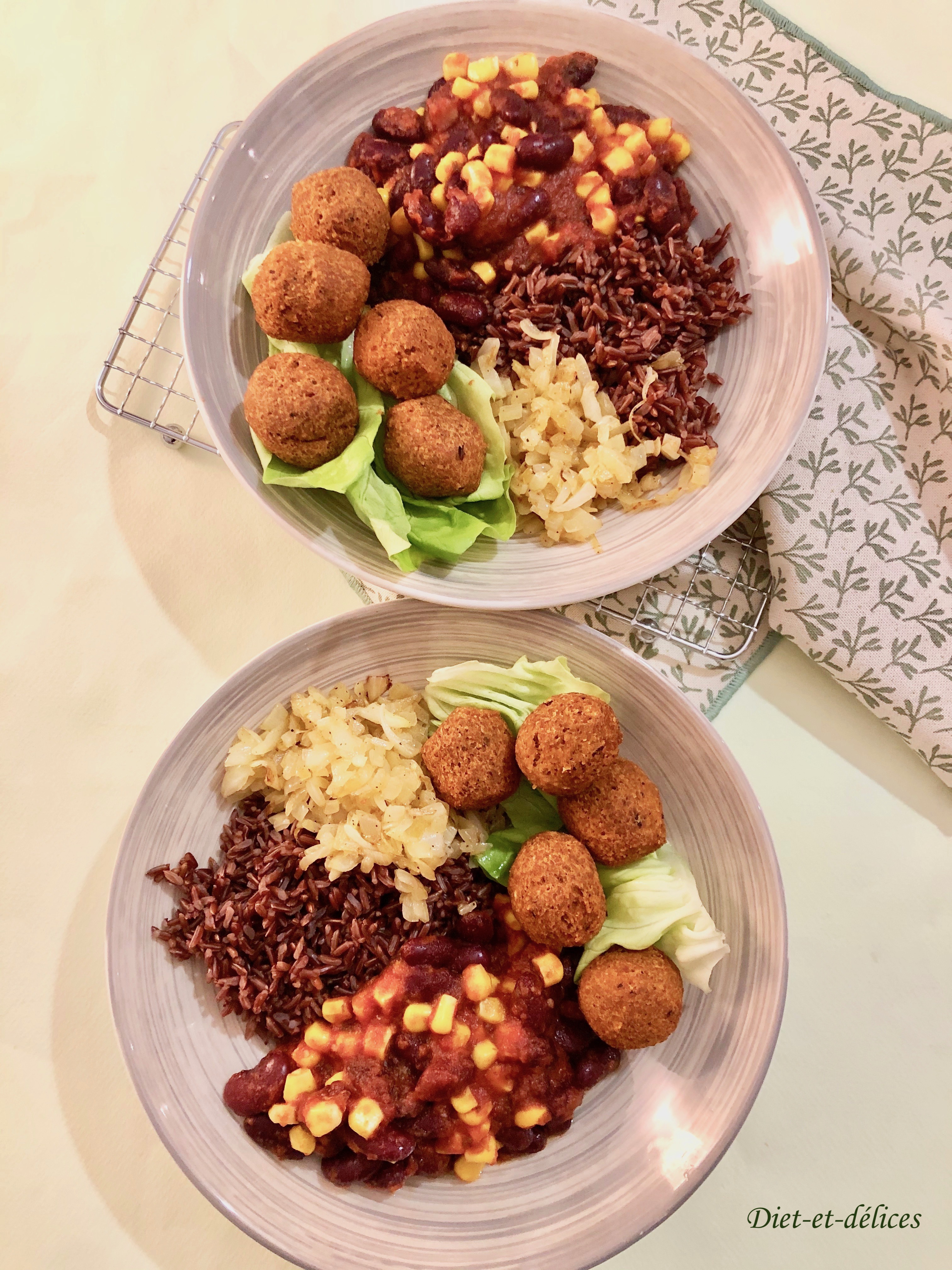 chili bowl, bowl , boulettes, haricots rouges, maïs, boulettes végétales, riz rouge