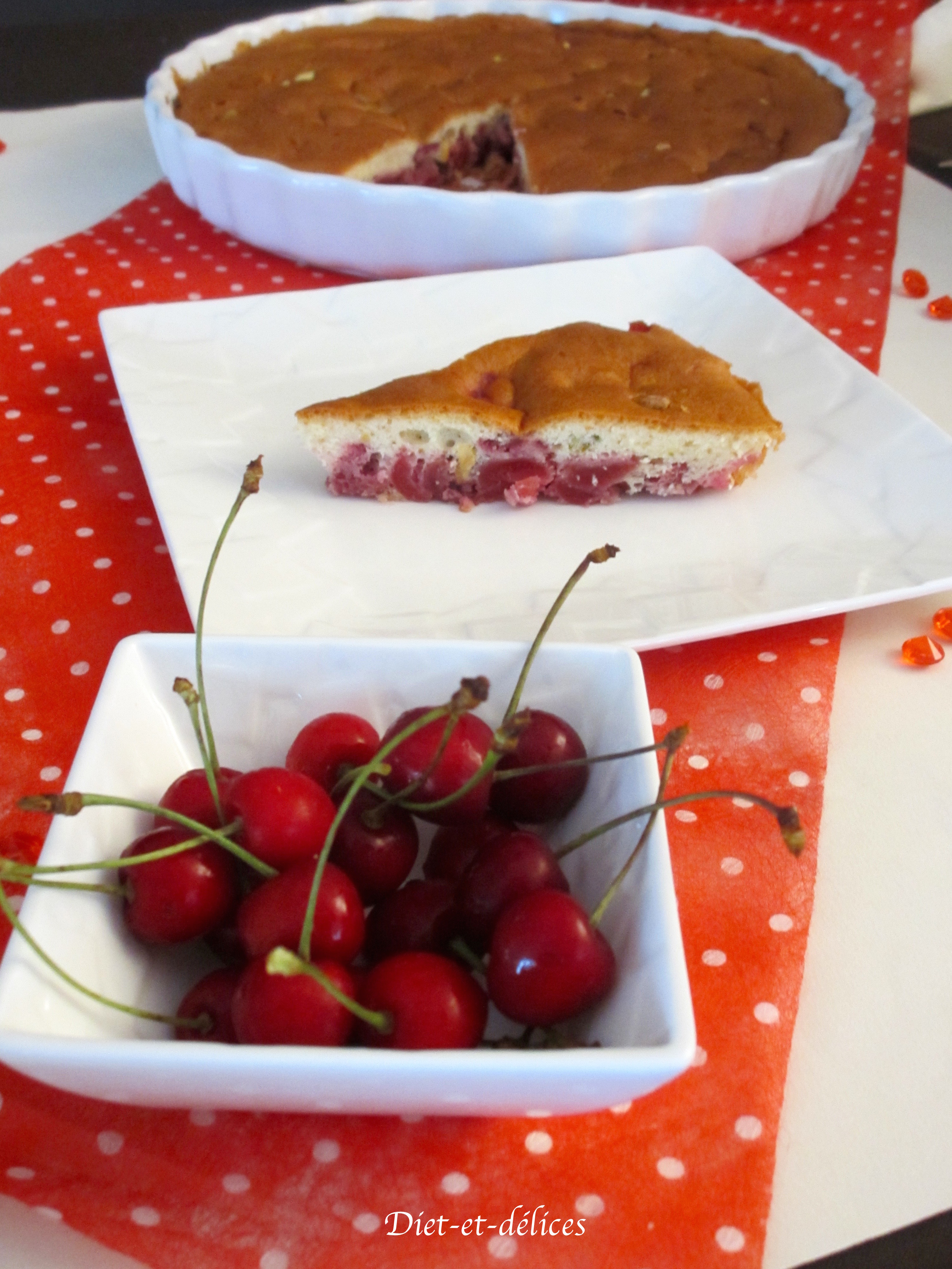 recette testée ce soir avec les moyens du bord: de la rhubarbe à la place des cerises et surtout de l’édulcorant à la place du sucre…. C’est excellent , bien moelleux.