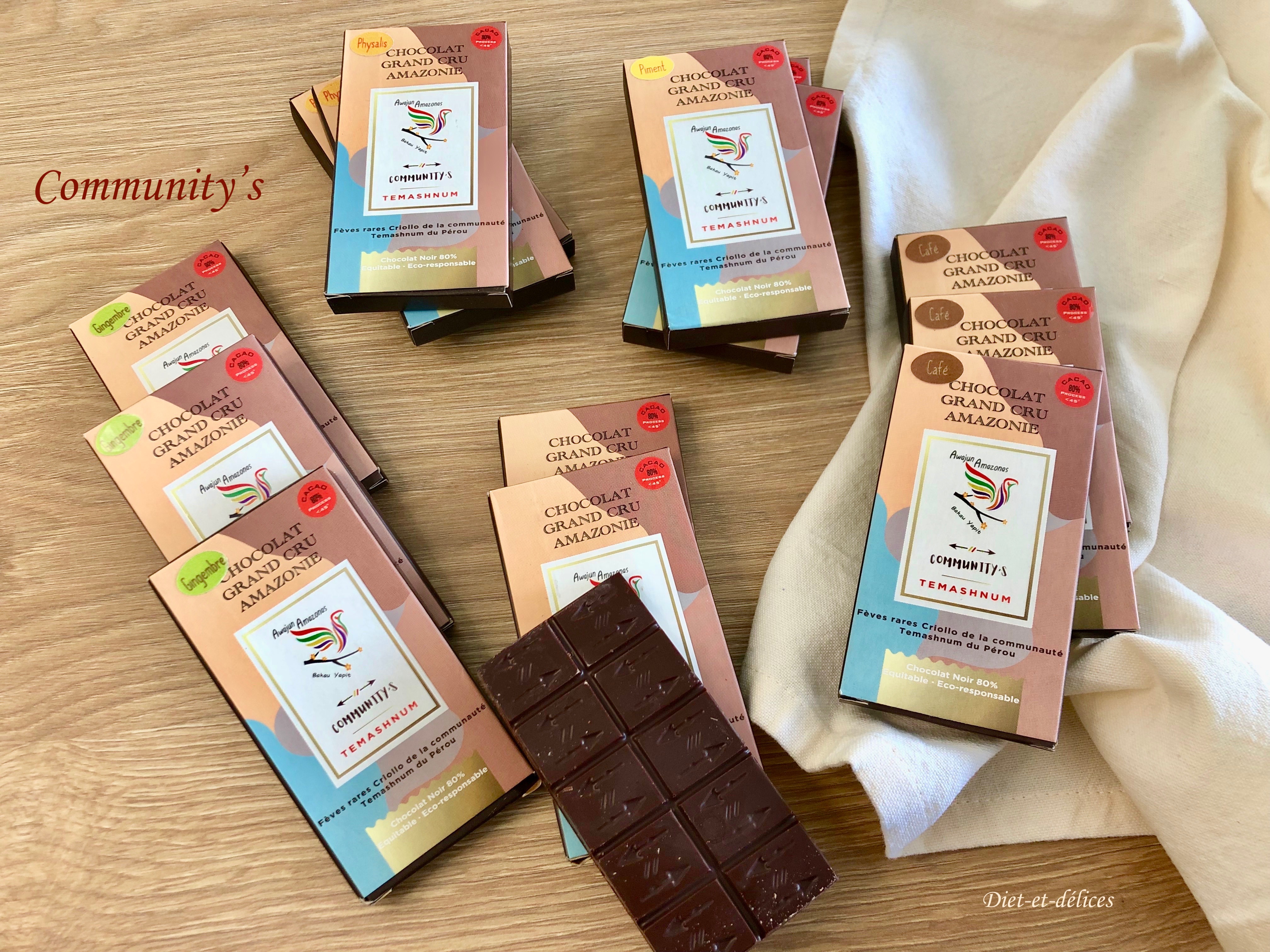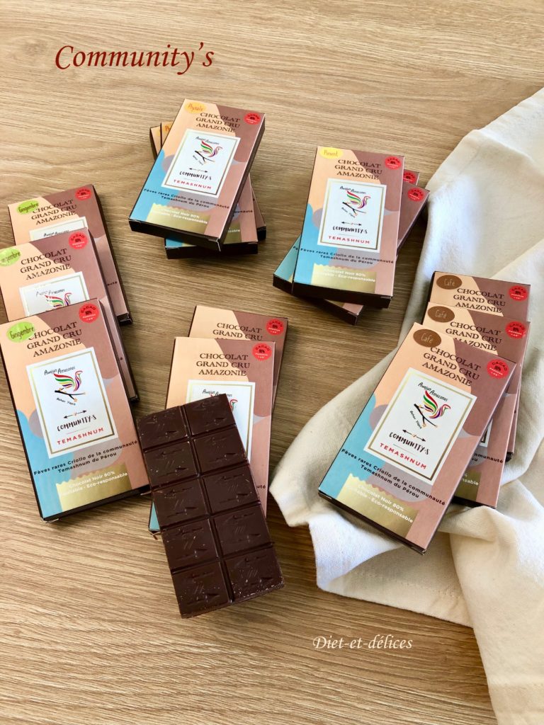 Community’s vous propose une gamme de chocolat grand cru d’exception tout en préservant l’environnement. Leur projet est de travailler en direct avec des communautés autochtones menacées dans leur patrimoine culturel afin d’offrir des produits d’exception et de fixer un prix équitable et solidaire. Ainsi, des variétés endémiques de cacao, des souches très anciennes en voie de disparition, sont préservées et ne sont pas remplacées par des plantations récentes, certes plus productives mais de bien moindre qualité.
