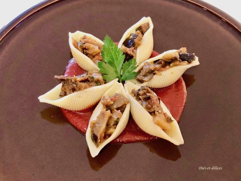 pâtes, conchiglioni, zaalouk, pâtes aux aubergines, épices, végétarien, pâtes, conchiglioni, zaalouk, pâtes aux aubergines, épices