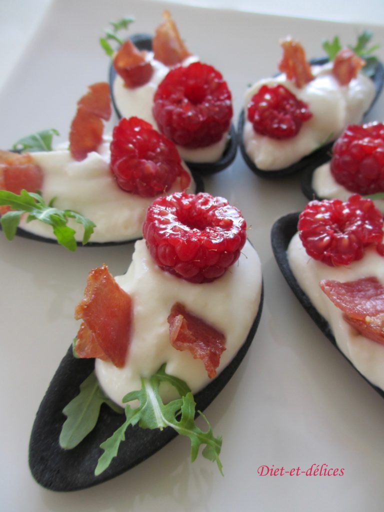 • Dans chaque coquille, mettre une demie framboise ainsi que deux petits morceaux de lard.