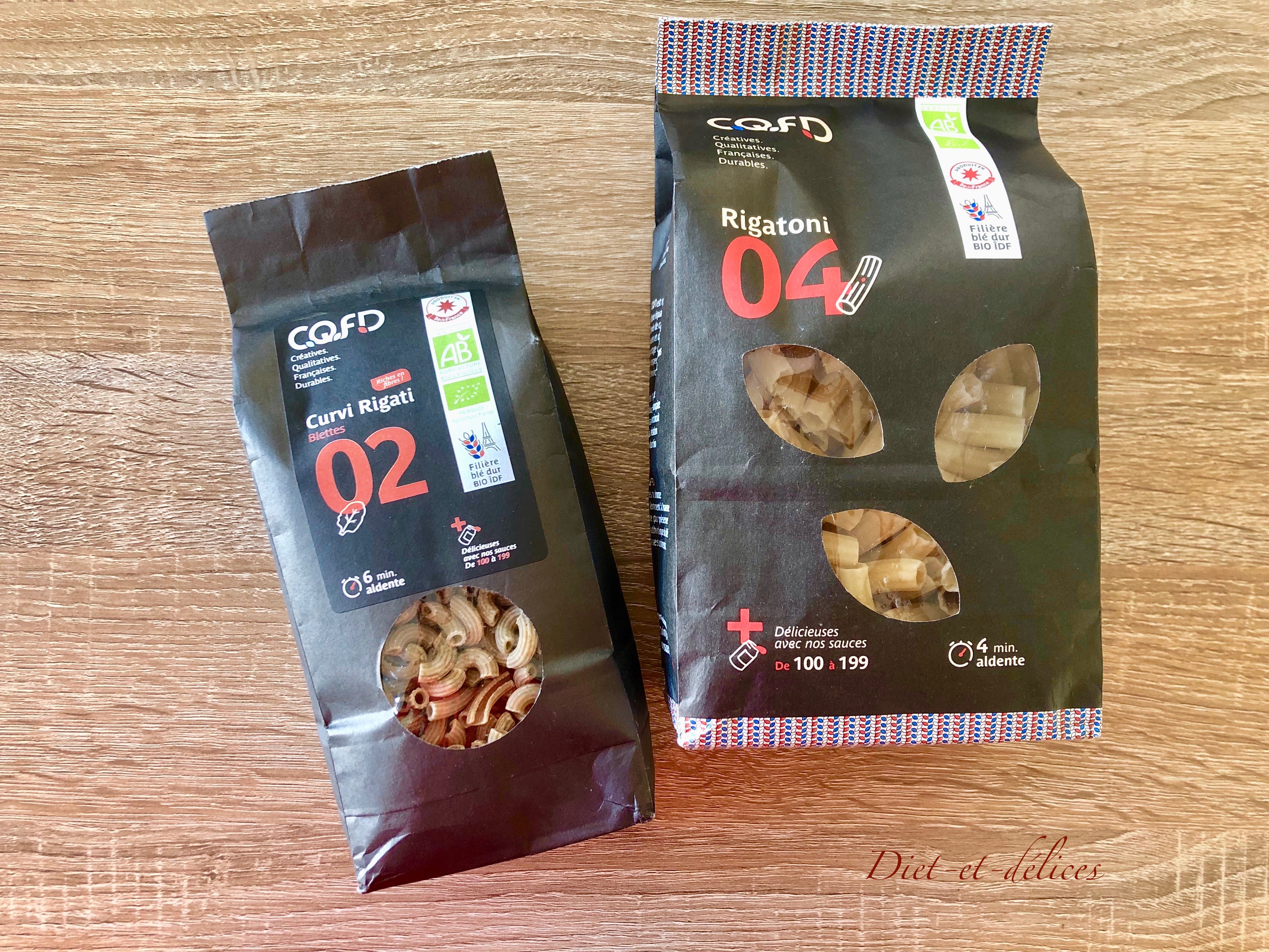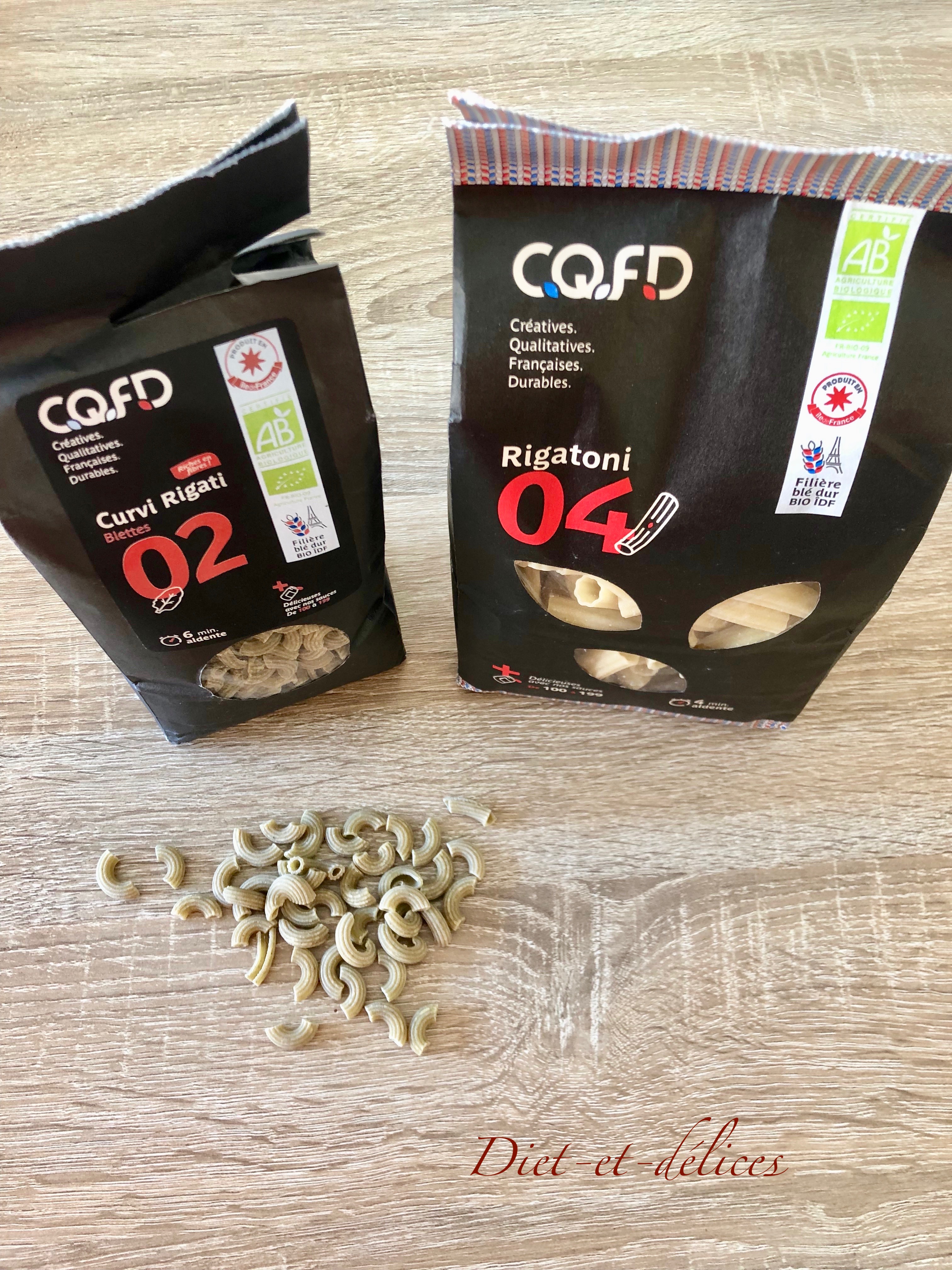 CQFD c’est avant tout Ce Qu’il Faut Déguster. Les pâtes sèches sont fabriquées dans un atelier à Meaux, à base de blé dur bio francilien et sont tréfilées au bronze. Toutes les pâtes sont composées de semoule de blé dur BIO, d’eau… et c’est tout ! Elles sont garanties sans additifs et sans conservateurs.Ce procédé artisanal traditionnel permet d’obtenir un aspect rugueux et poreux aux pâtes permettant de retenir la sauce et bénéficiant d’un temps de cuisson relativement rapide. Les pâtes sont séchées lentement à basse température afin de conserver la saveur authentique du blé dur et afin de préserver les nutriments. Différentes sortes de pâtes sont disponibles : Trottole, Fidanzati capresi, Fusilloni, Gnocchetti sardi, Rigatoni, Curvi Rigati. Selon les formes, divers parfums sont proposés : complet, aux lentilles, aux pois cassés, aux pois chiches, à la betterave, à la tomate, au potimarron & curcuma, aux feuilles de blettes.