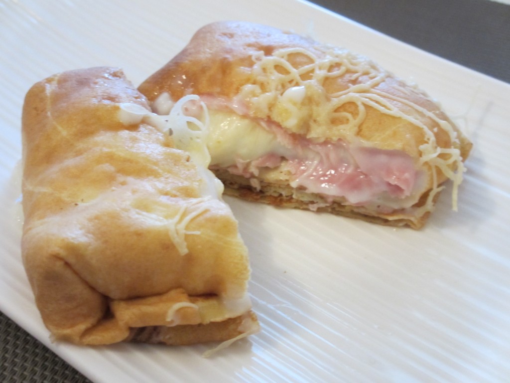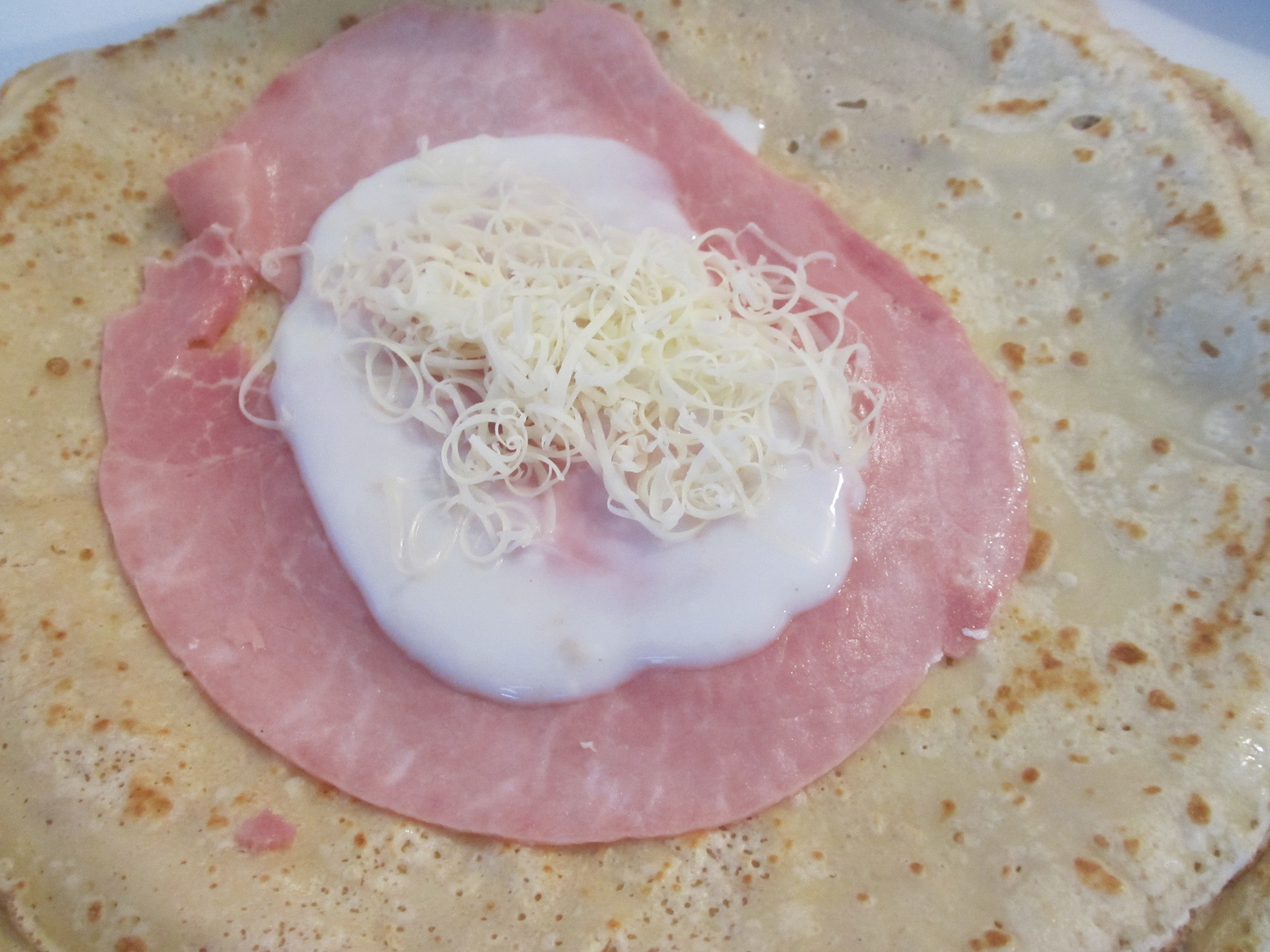 - Etaler une cuillère à soupe de béchamel sur la crêpe. Recouvrir d’une tranche de jambon. Remettre une cuillère à soupe de béchamel. Parsemer d’une petite poignée de gruyère râpé.
