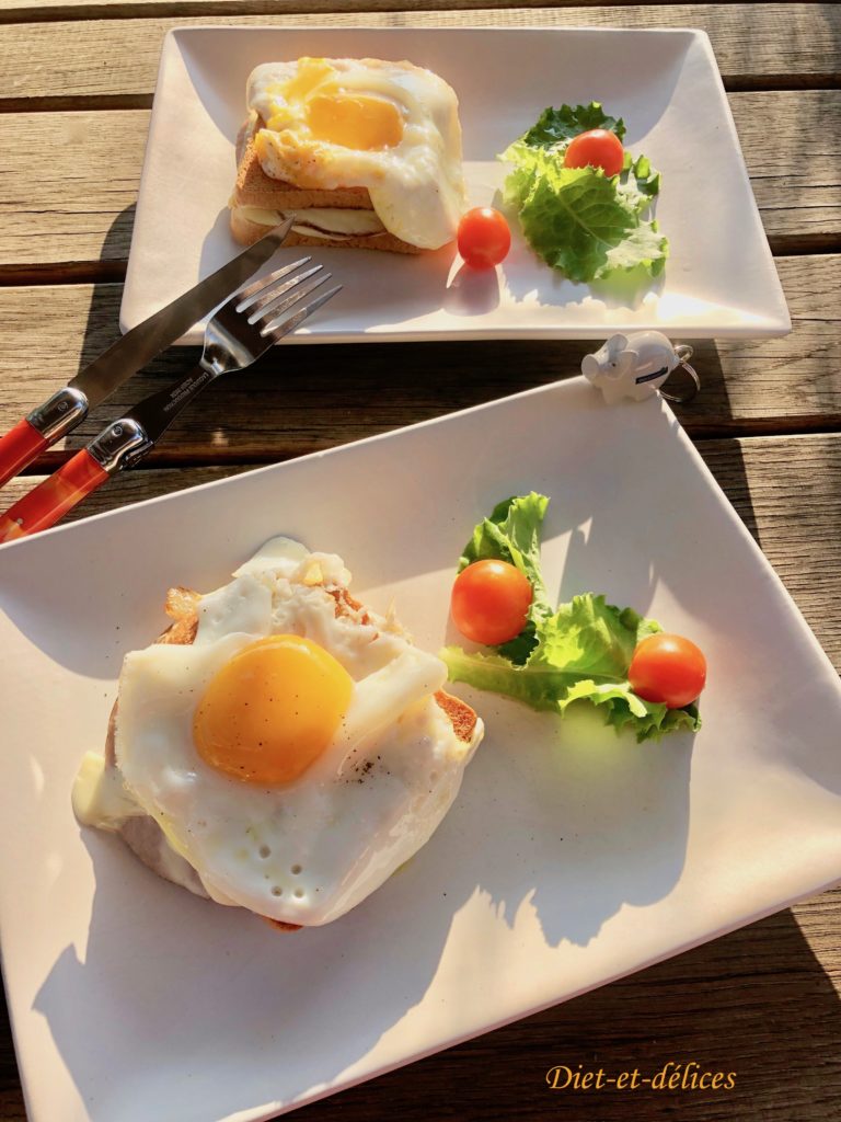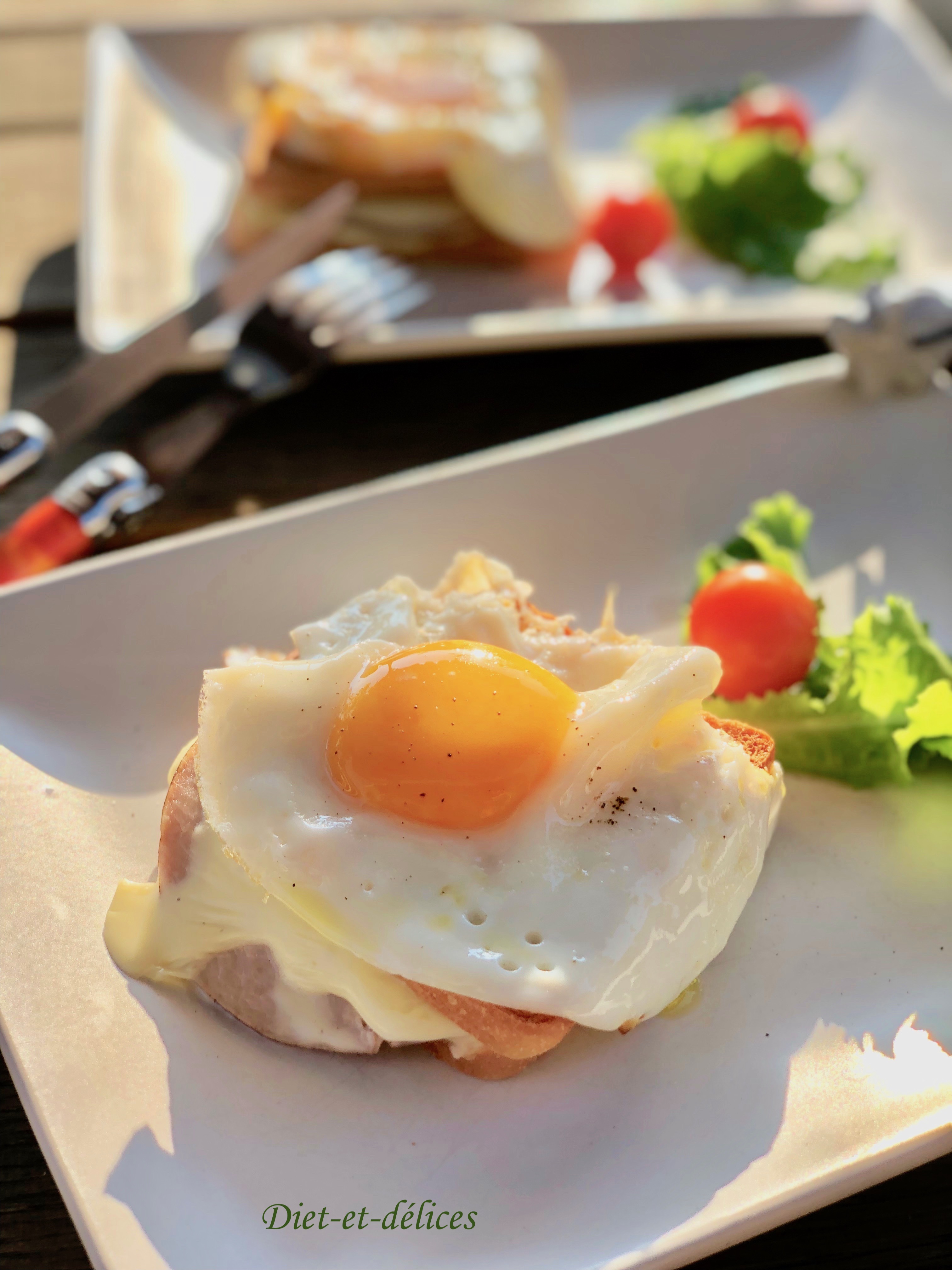 - Disposer délicatement un oeuf au plat sur chaque croque avant de les servir.