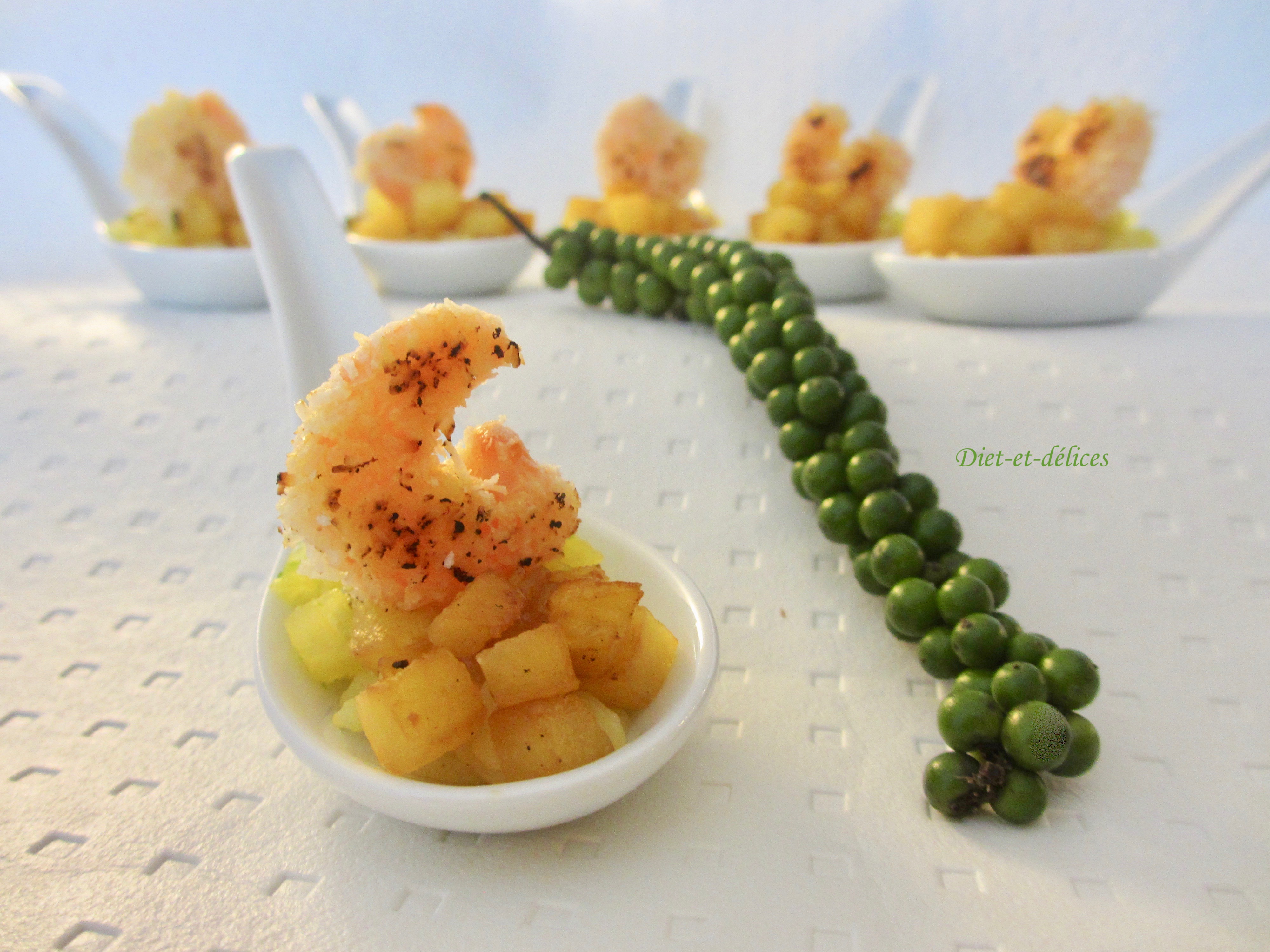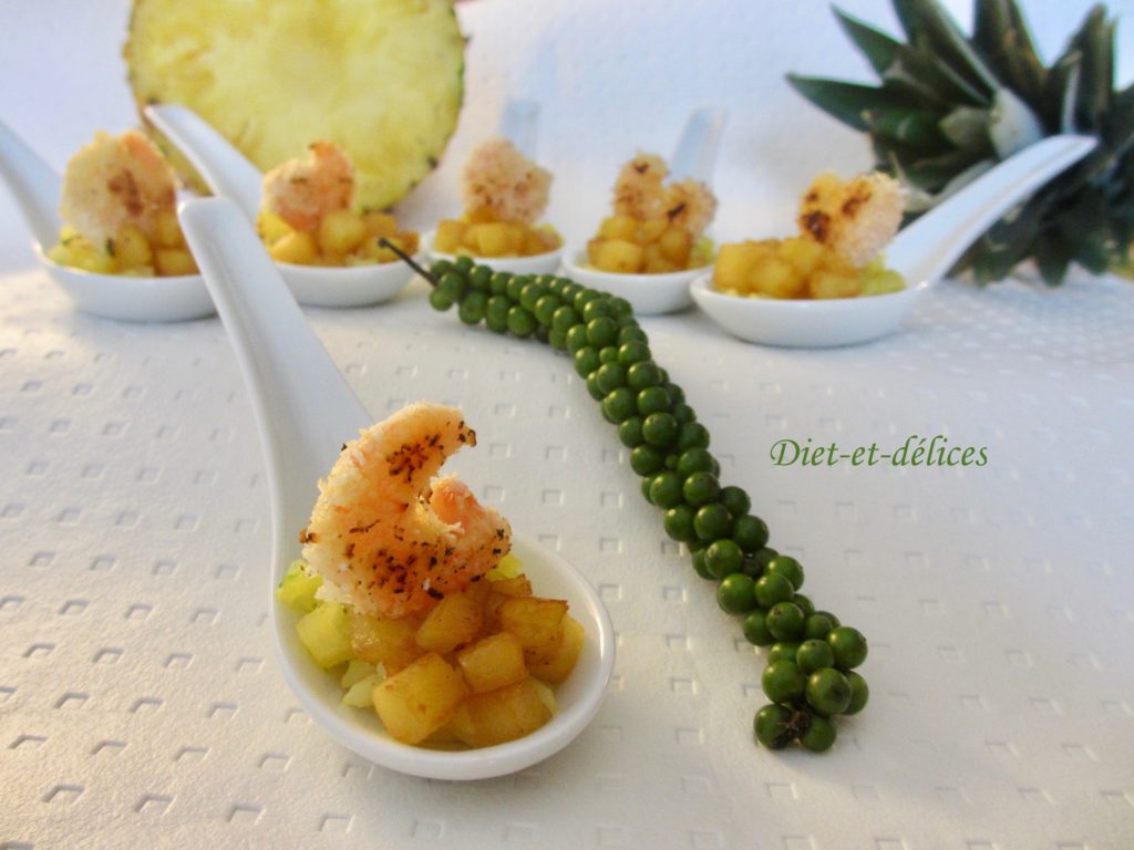 apéro, cuillères apéritives, crevettes, ananas , curry, noix de coco