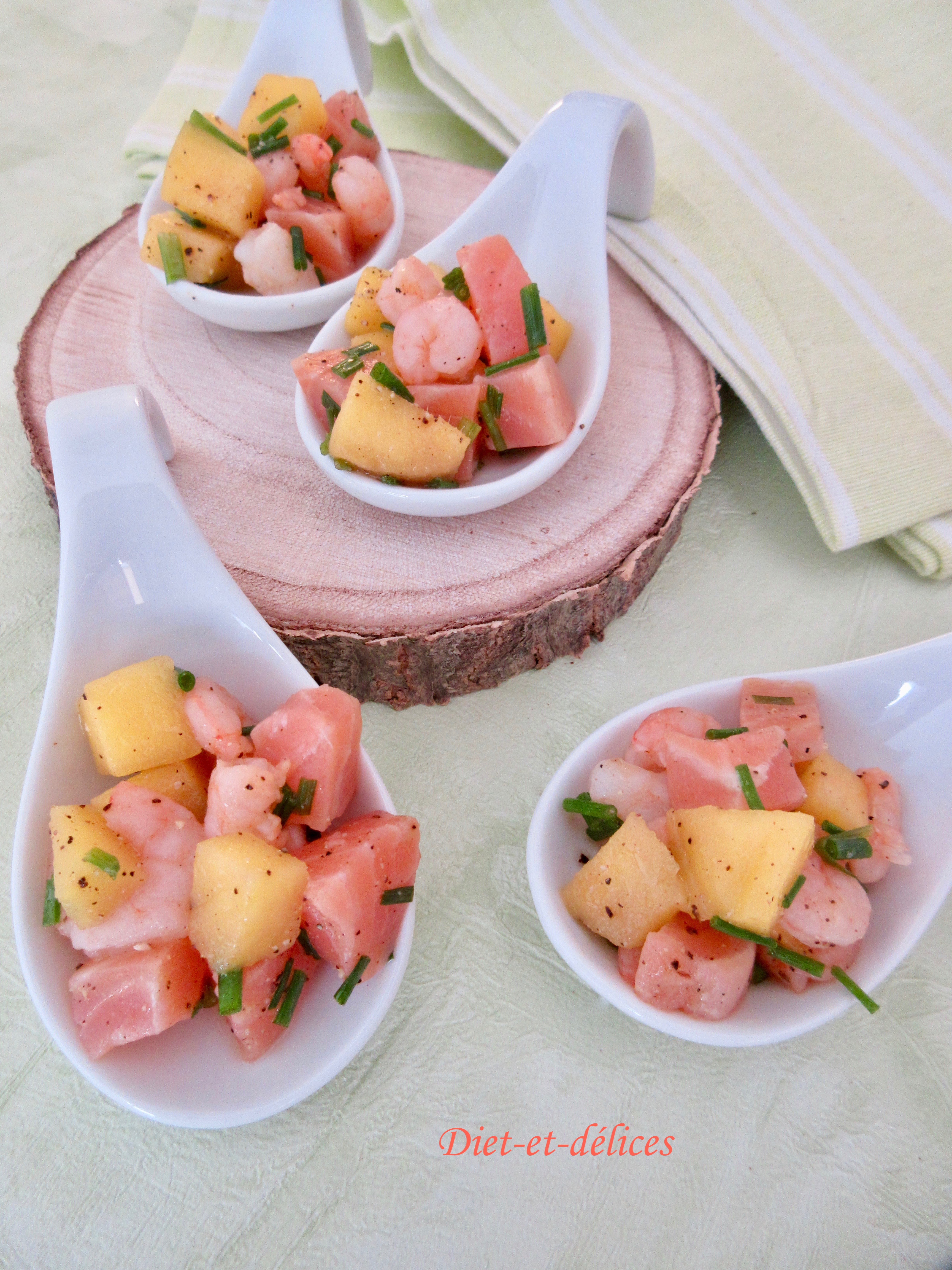 apéritif, apéro, cuillères apéritives, saumon, saumon fumé, crevettes, mangue, ciboulette, sucré salé
