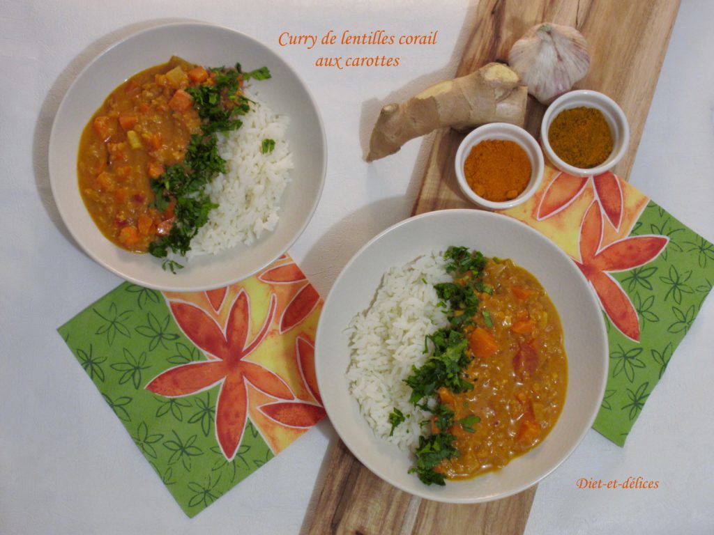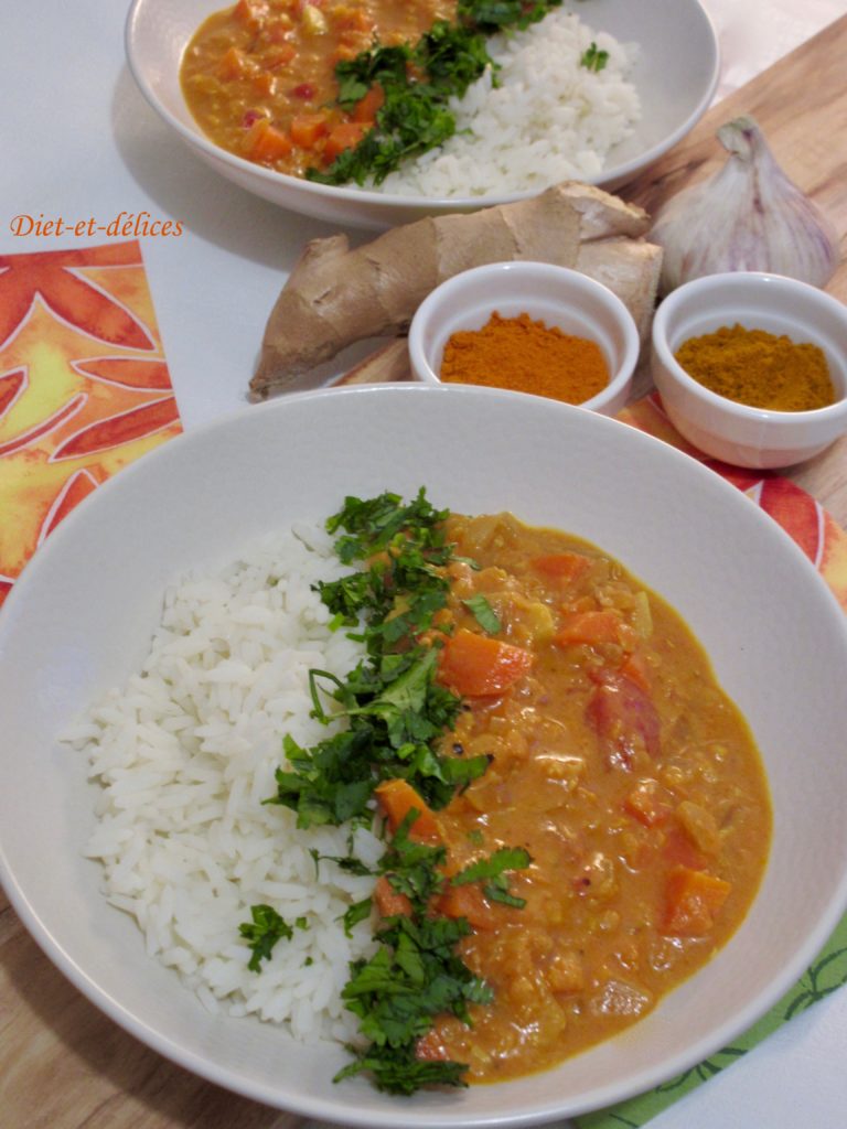 lentilles , lentilles corail, carottes, dahl, curry, curry végétal, lait de coco, noix de coco, diététique