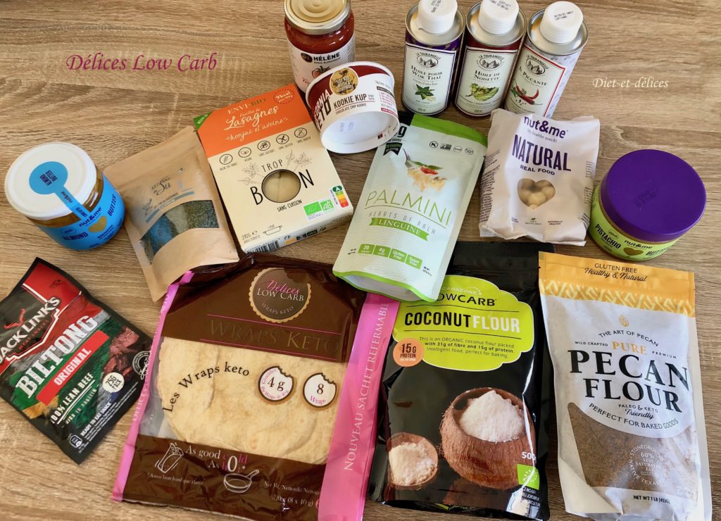 - – dans l’épicerie salée : pâtes faible en glucides, konjac, coeur de palmier, tortilla wrap keto, sauces sans sucre, spray de cuisson, épices, huiles végétales, beurre (cacahuète, noix, amande, pistache…), ghee …