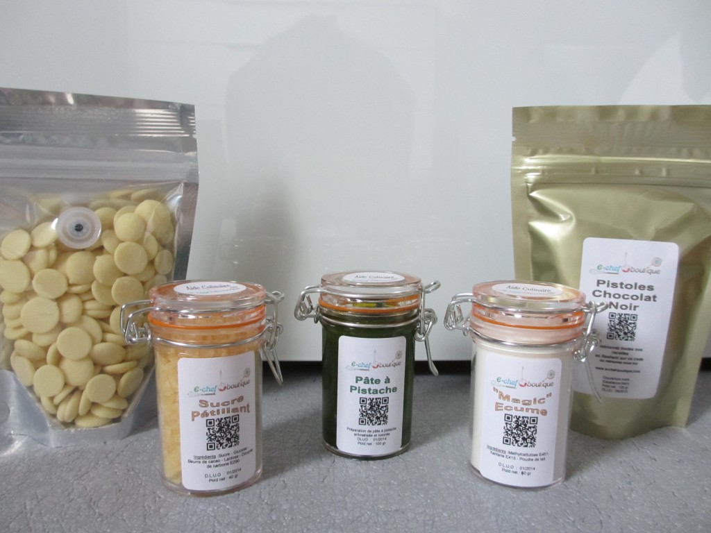 - – des ingrédients de pâtisserie : sucre pétillant, pâte à pistache, pistoles de chocolat …