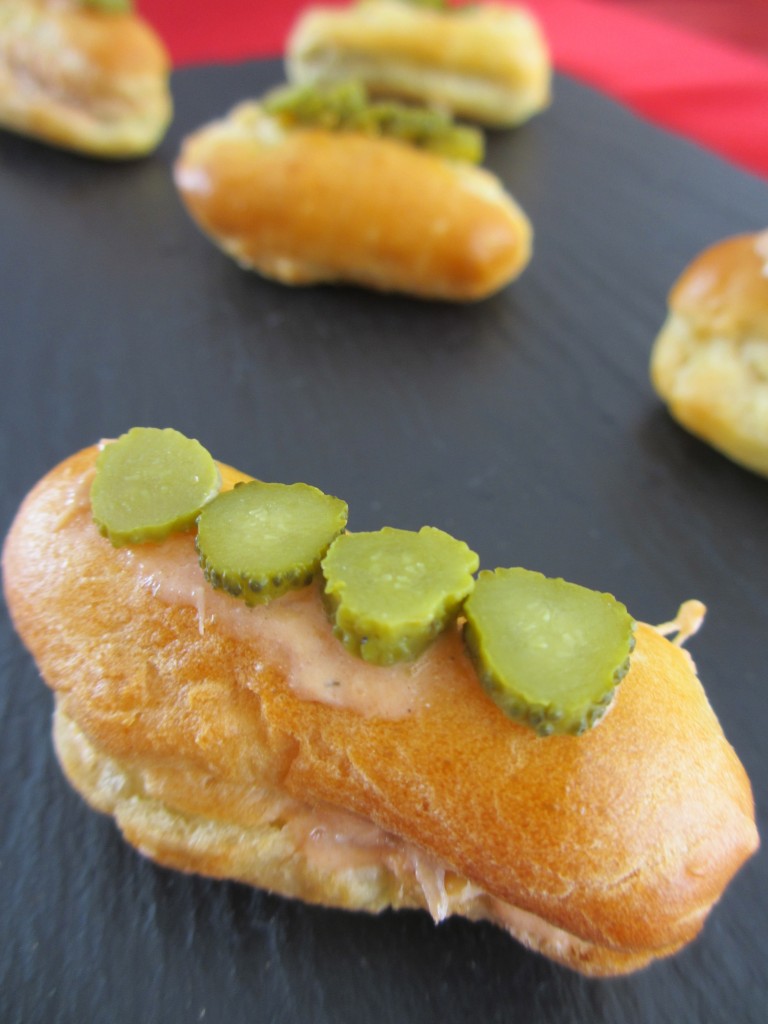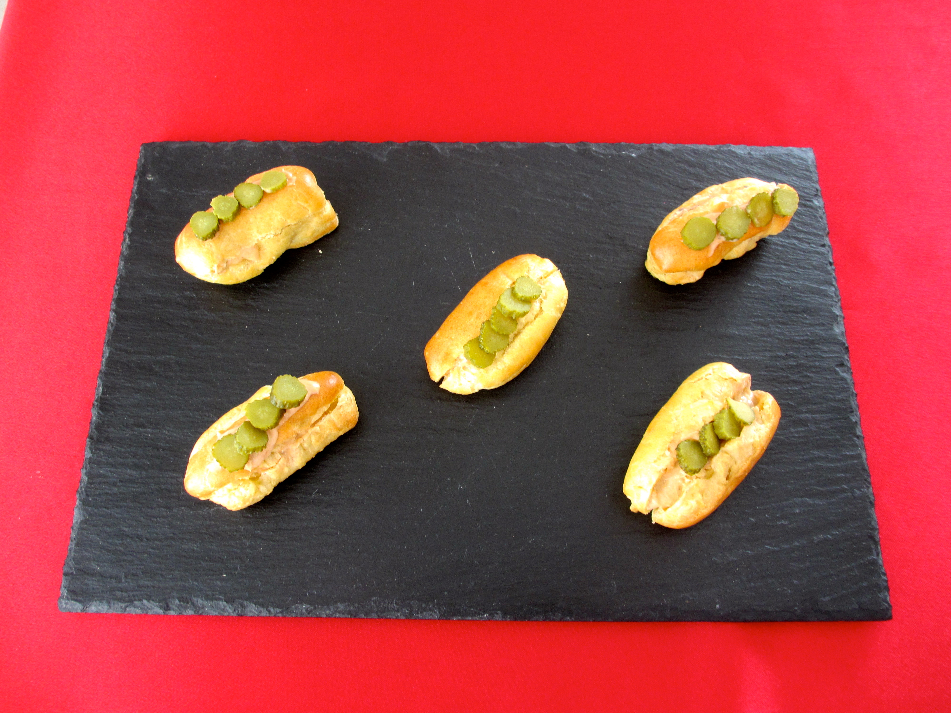 - Décorer les éclairs avec les rondelles de cornichon.