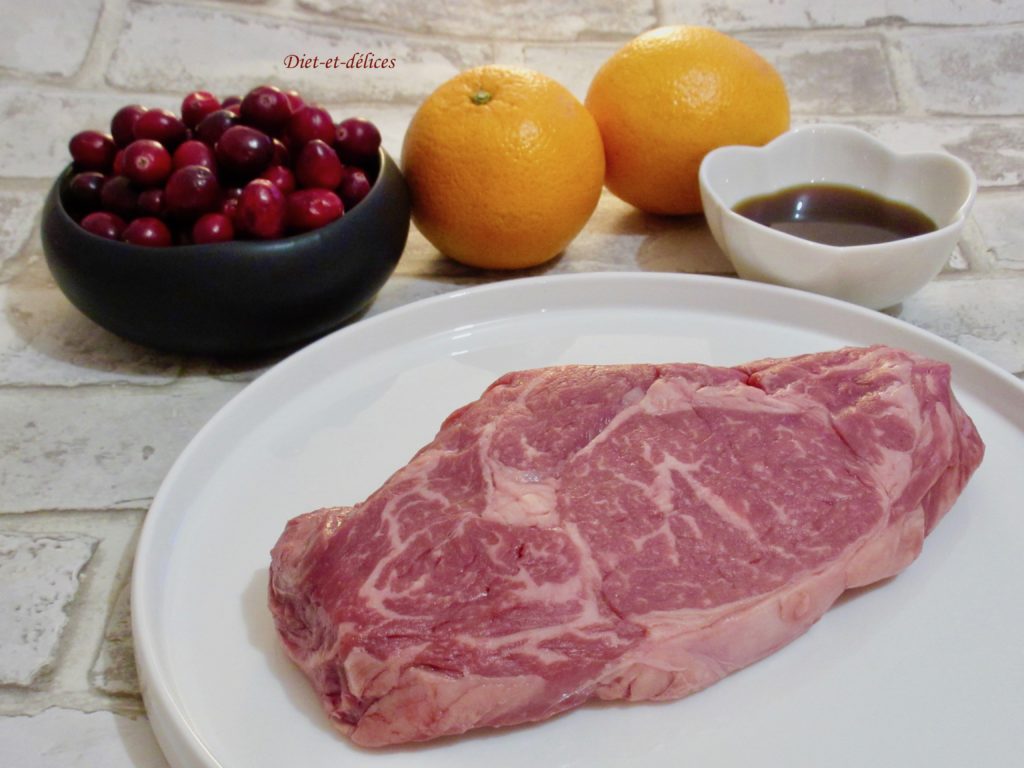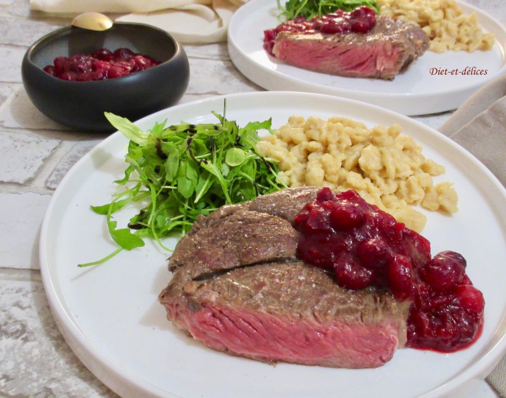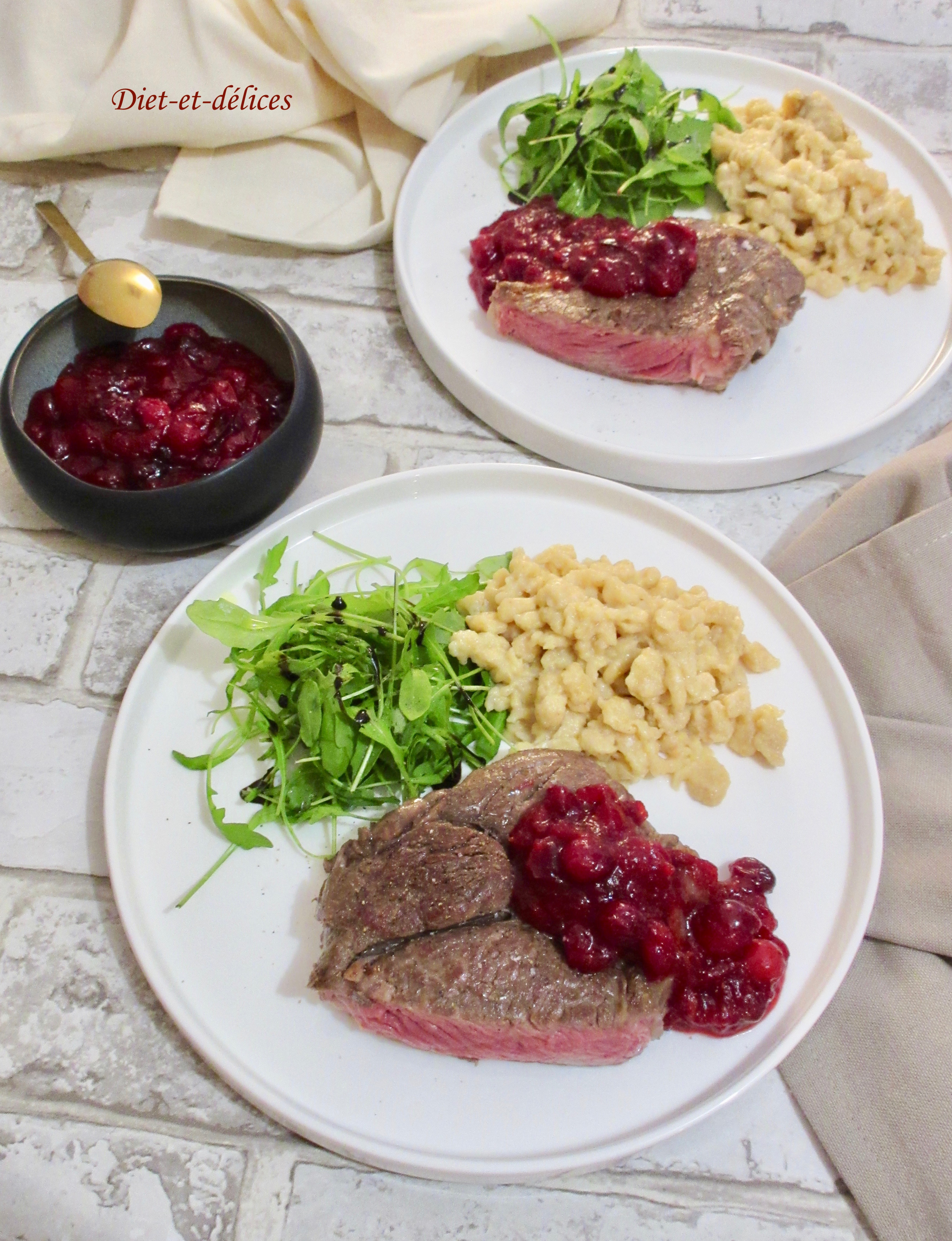 entrecôte, boeuf, canneberges, sauce aux canneberges, cranberry, cranberries, spatzle, plat complet, basse température