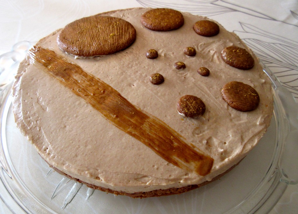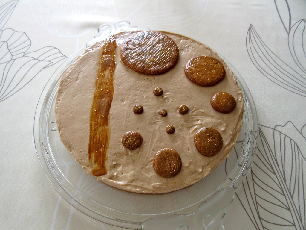 - Le lendemain, décore l’entremet avec des disques de palet breton recouvert de praliné et de poudre dorée.