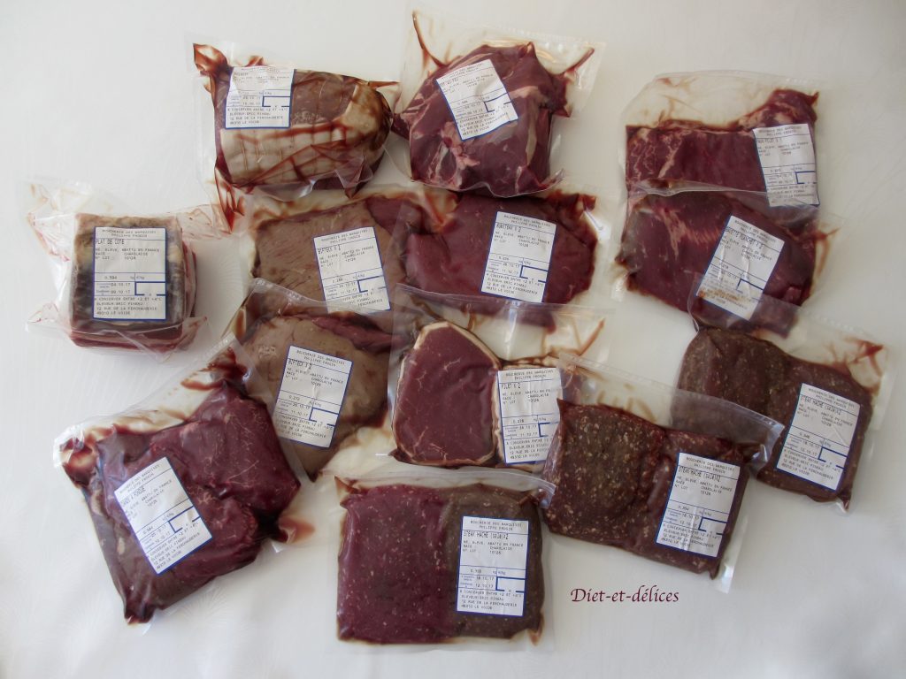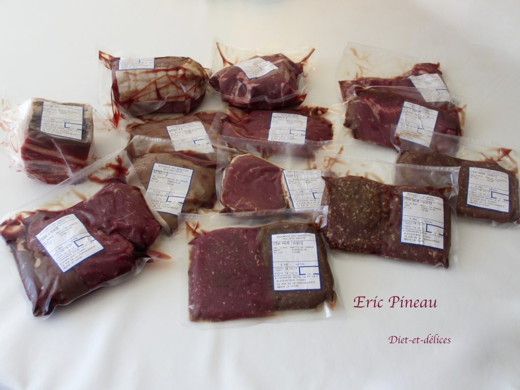 Je remercie grandement mon partenaire Eric Pineau pour ce beau colis de boeuf composé de steak haché, plat de côte, viande à fondue, biftecks, filets de boeuf, bavette flanchet, faux filet, rumsteak, pot au feu et rosbeef.