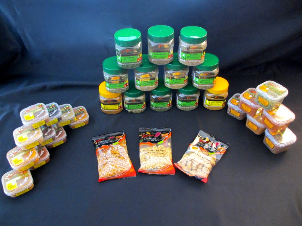 - – des herbes de Provence, des épices spéciales grillades, de thym, des feuilles de laurier, de la ciboulette tubulaire déshydratée, du persil en flocon, de l’origan, des feuilles de basilic, du romarin, des feuilles d’estragon