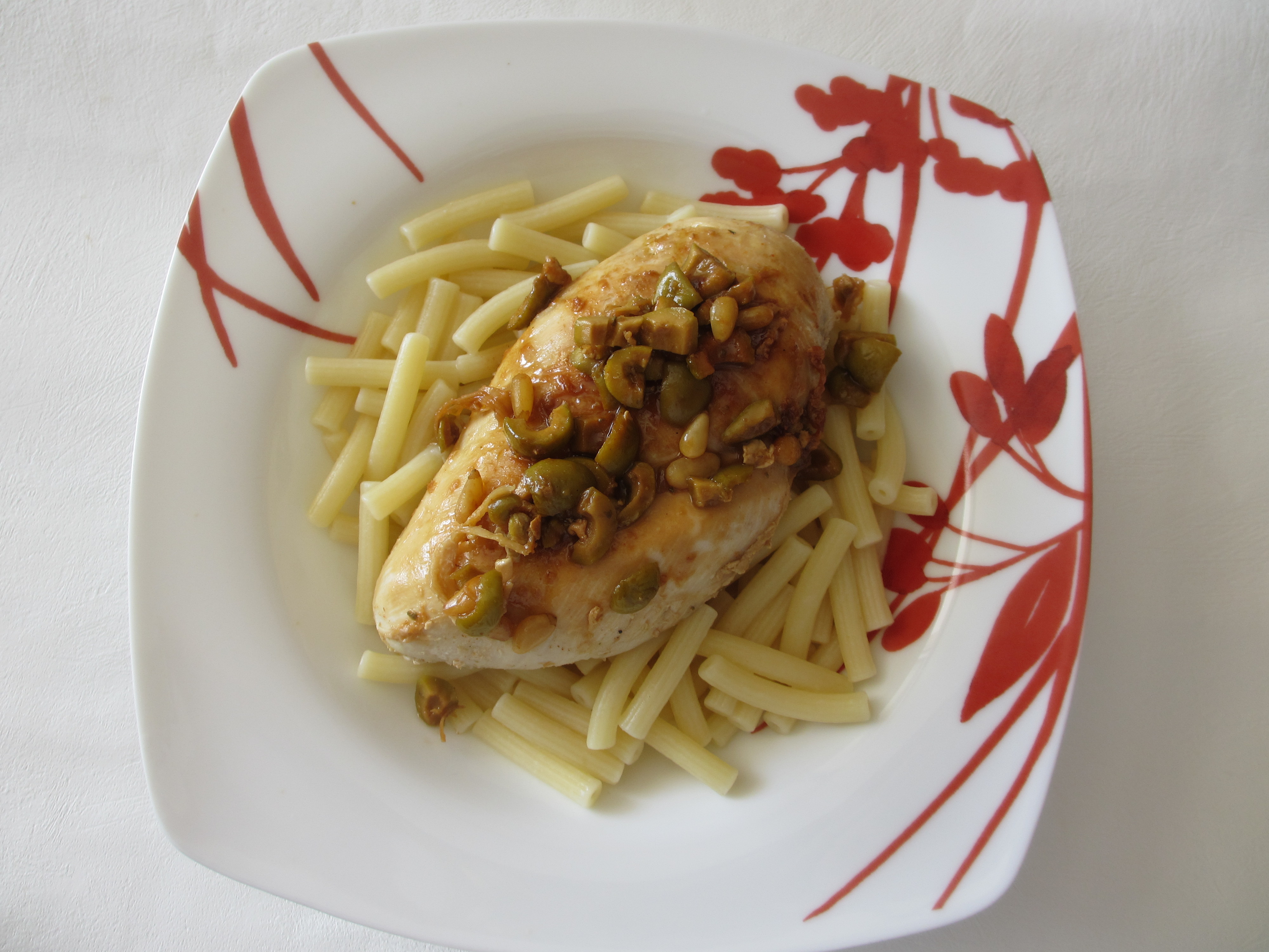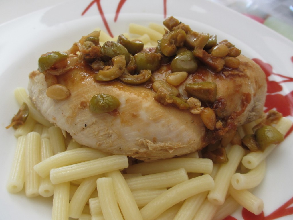 poulet, filet de poulet, poulet aux olives, olives, olives vertes, olives aux anchois pignons de pin, piment, piment doux, viande, protéines