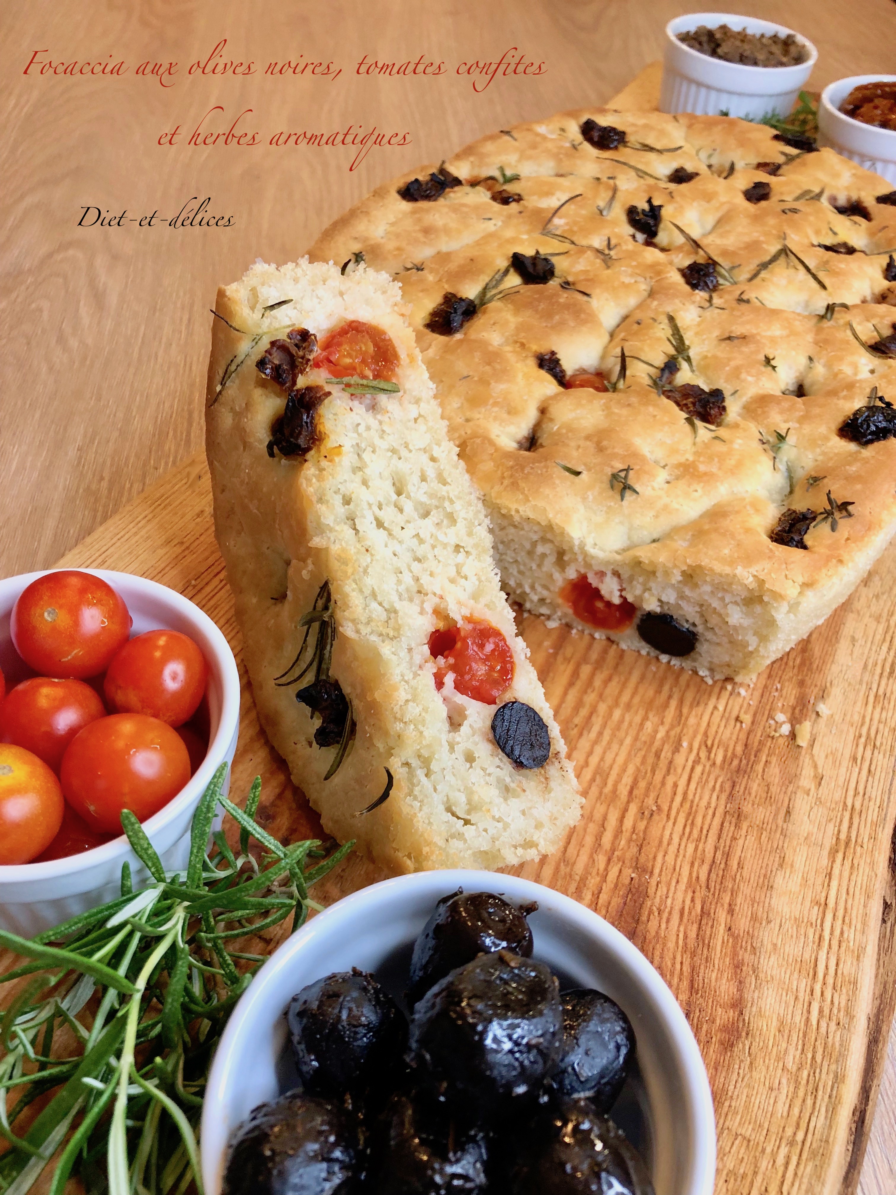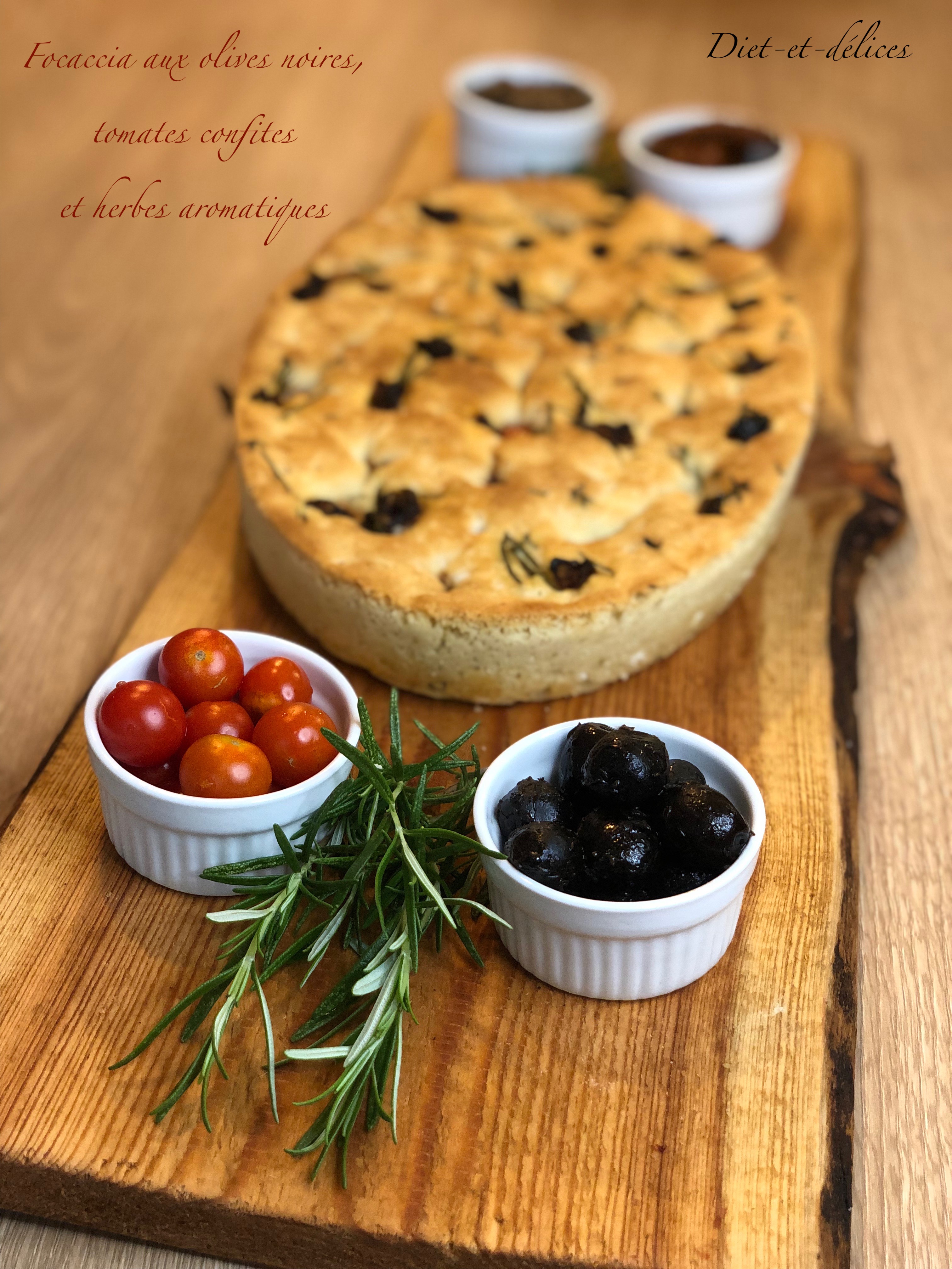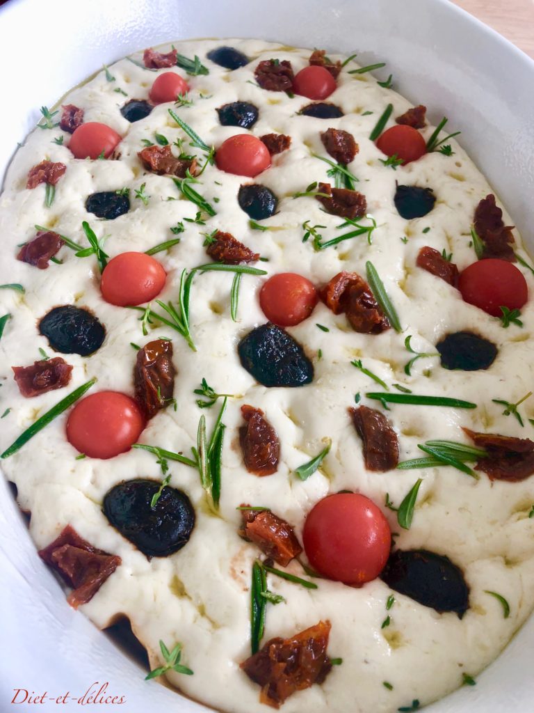focaccia, olives noires, apéro, tomates confites, tomates cerises, romarin, sarriette, thym, fleur de sel