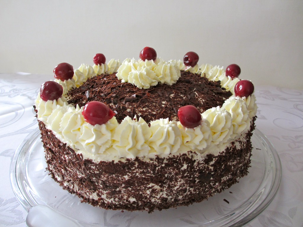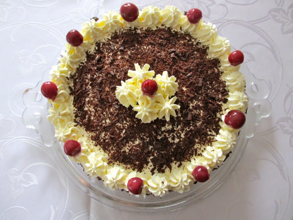 - A l’aide d’une poche à douille, réaliser quelques fleurs en chantilly et y disposer quelques cerises.