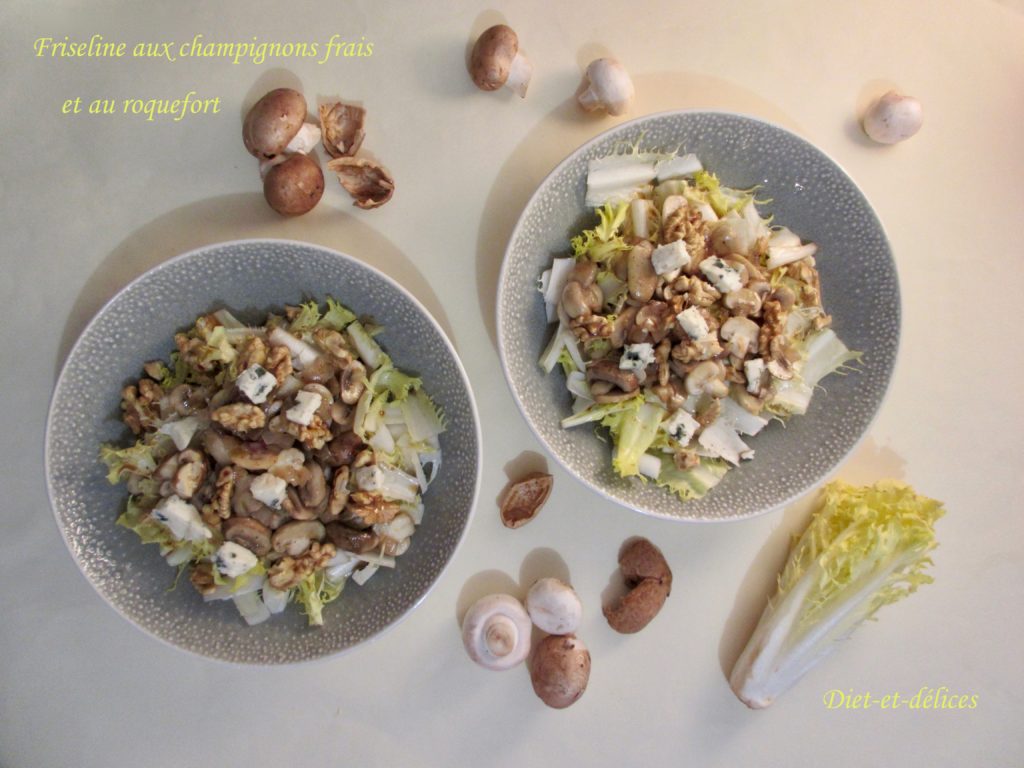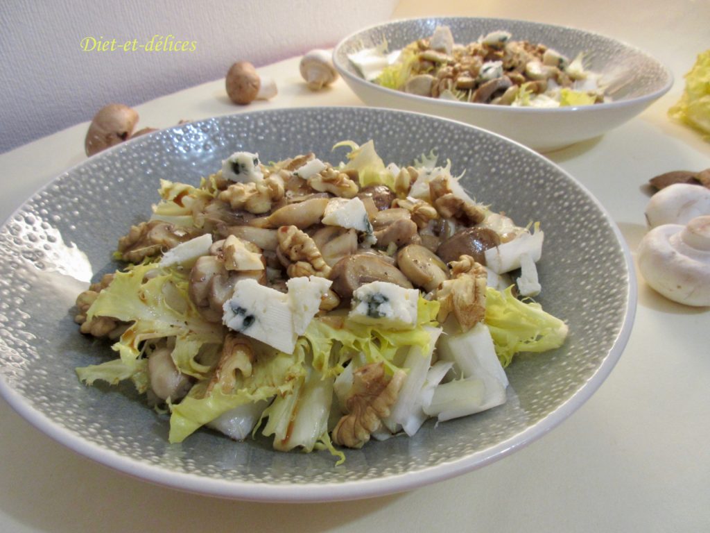 friseline, salade, noix, roquefort, champignons frais, huile de noix
