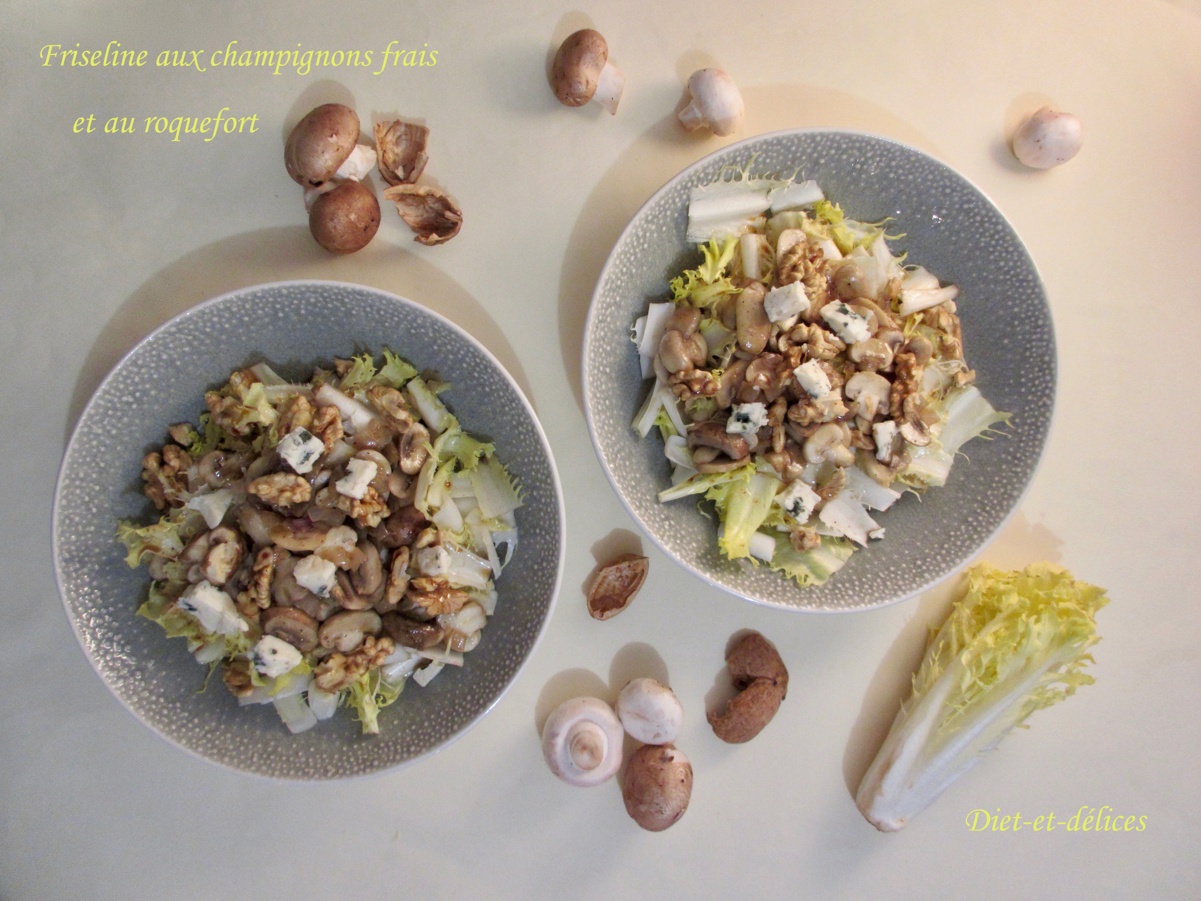 friseline, salade, roquefort, noix, champignons frais, végétarien