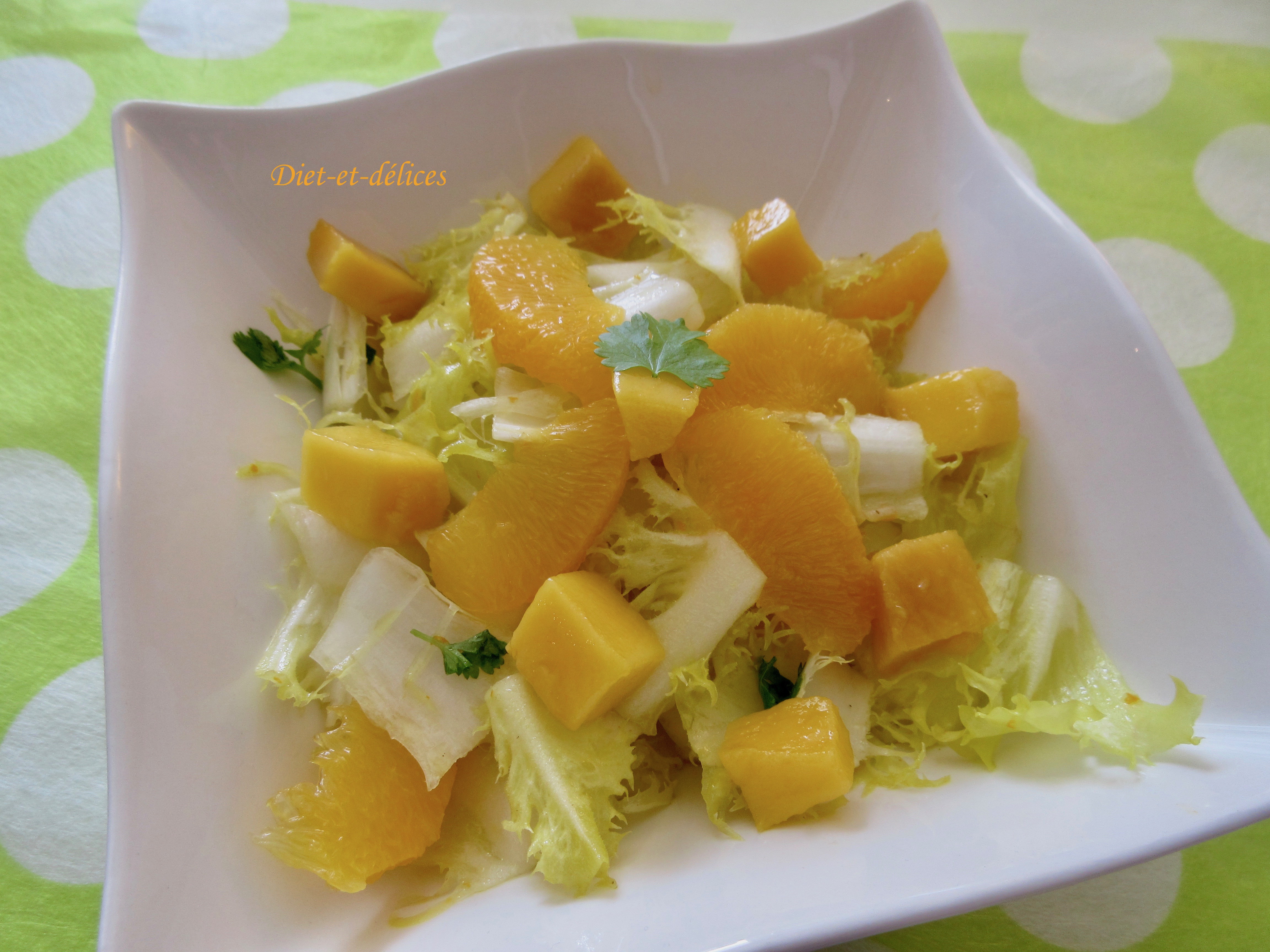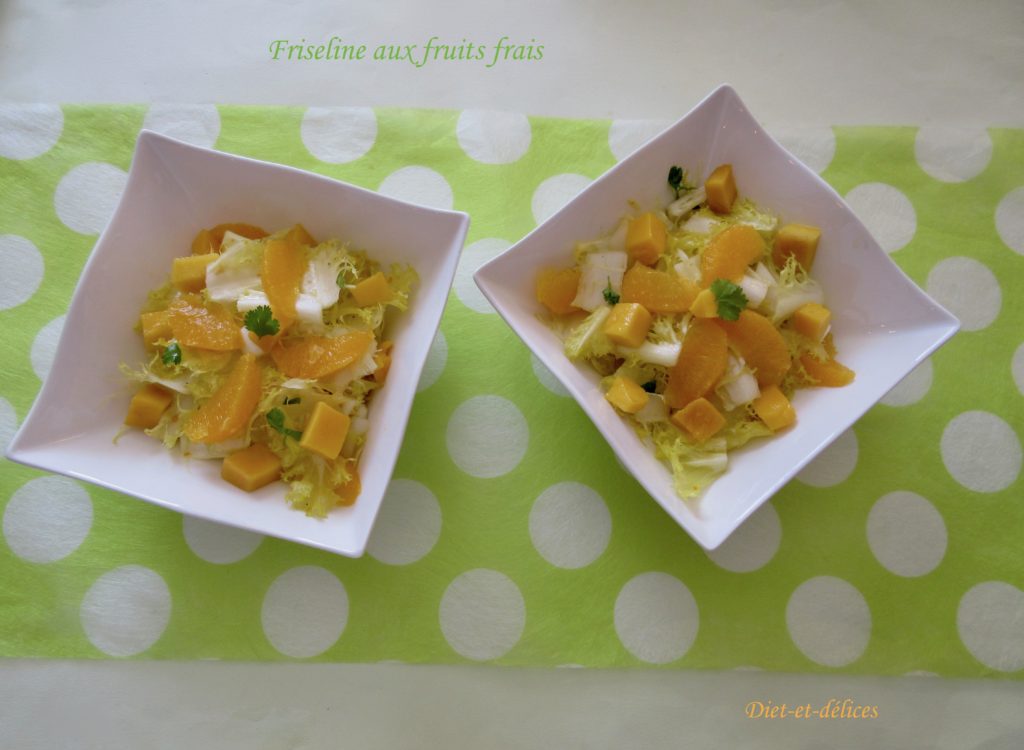vegan, salade, friseline, sucré salé, salade aux fruits frais, mangue, orange