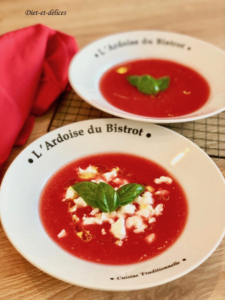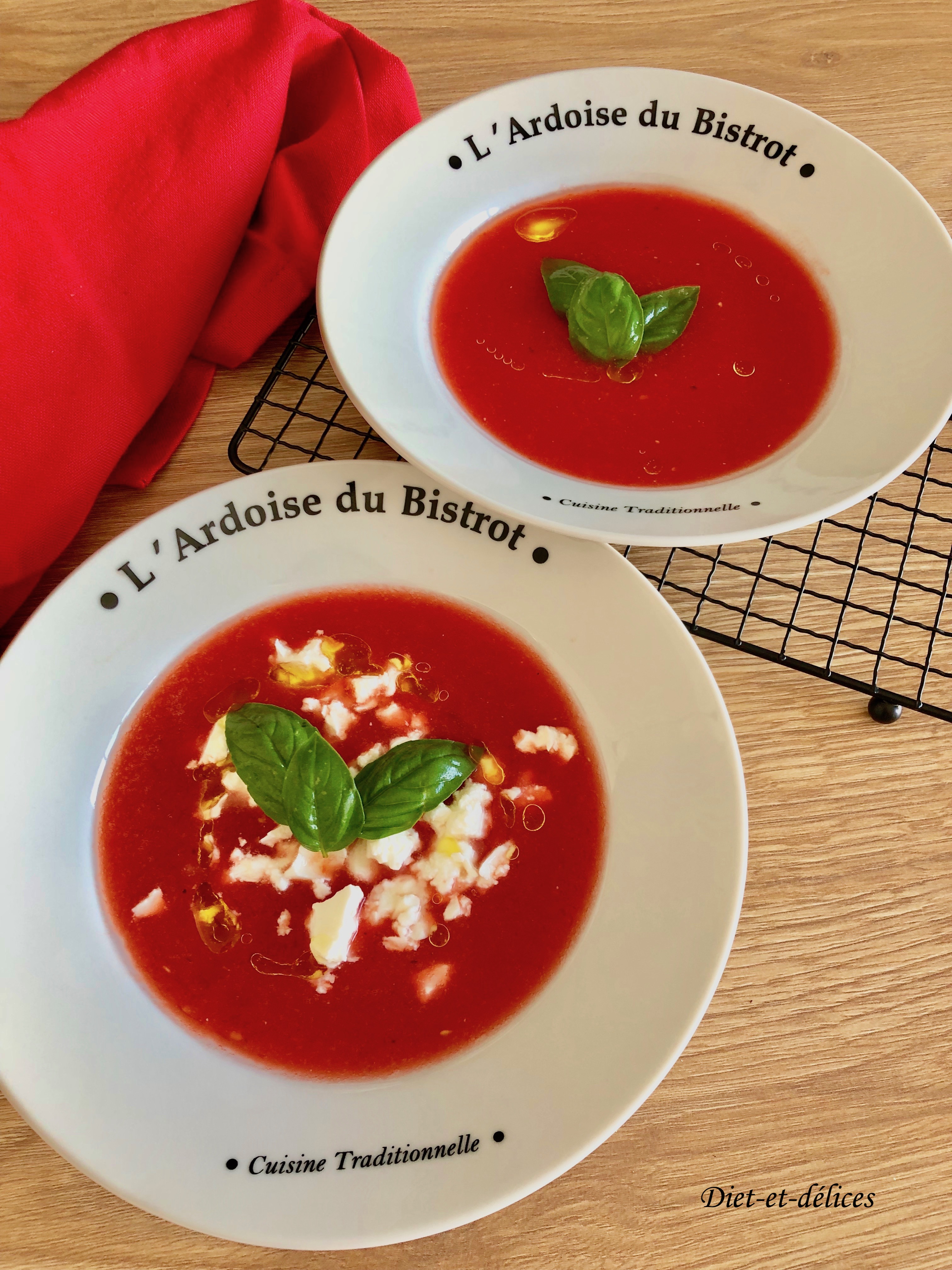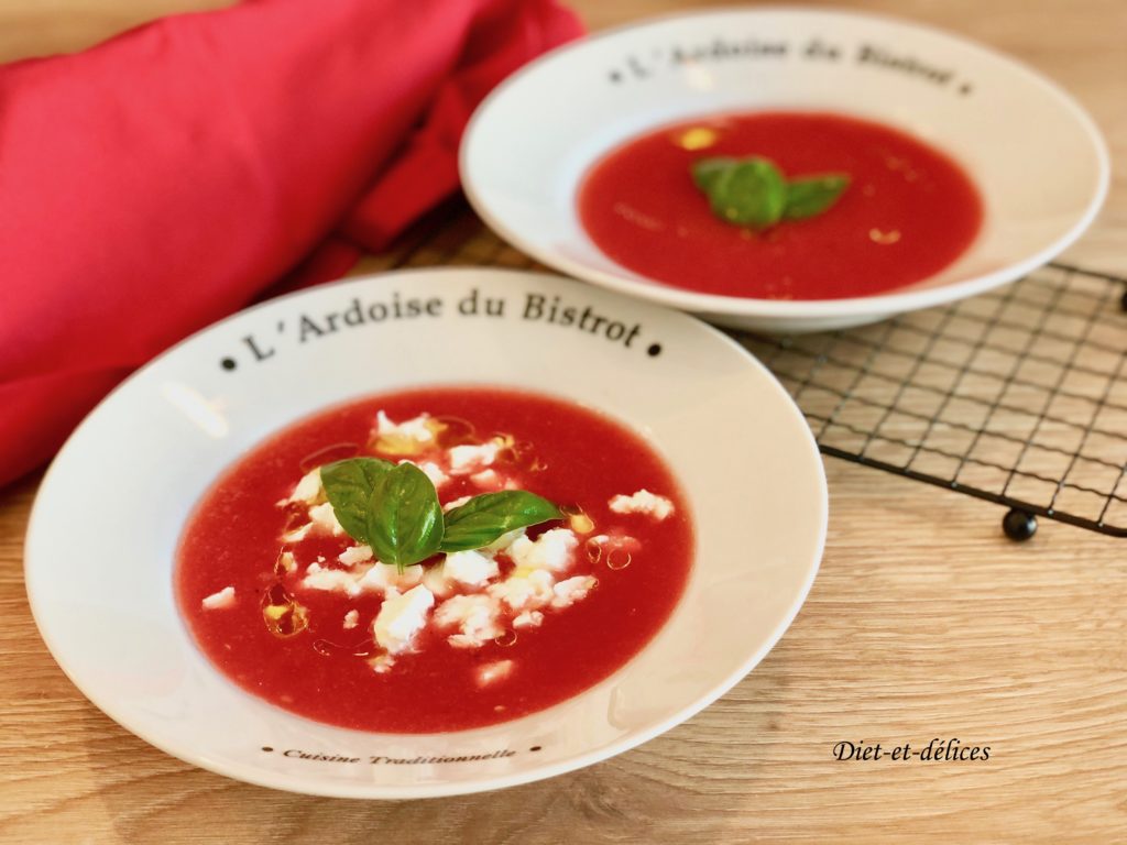 gaspacho, soupe froide, pastèque, tomate, poivron, piment d’Espelette, végétarien, feta, soupe
